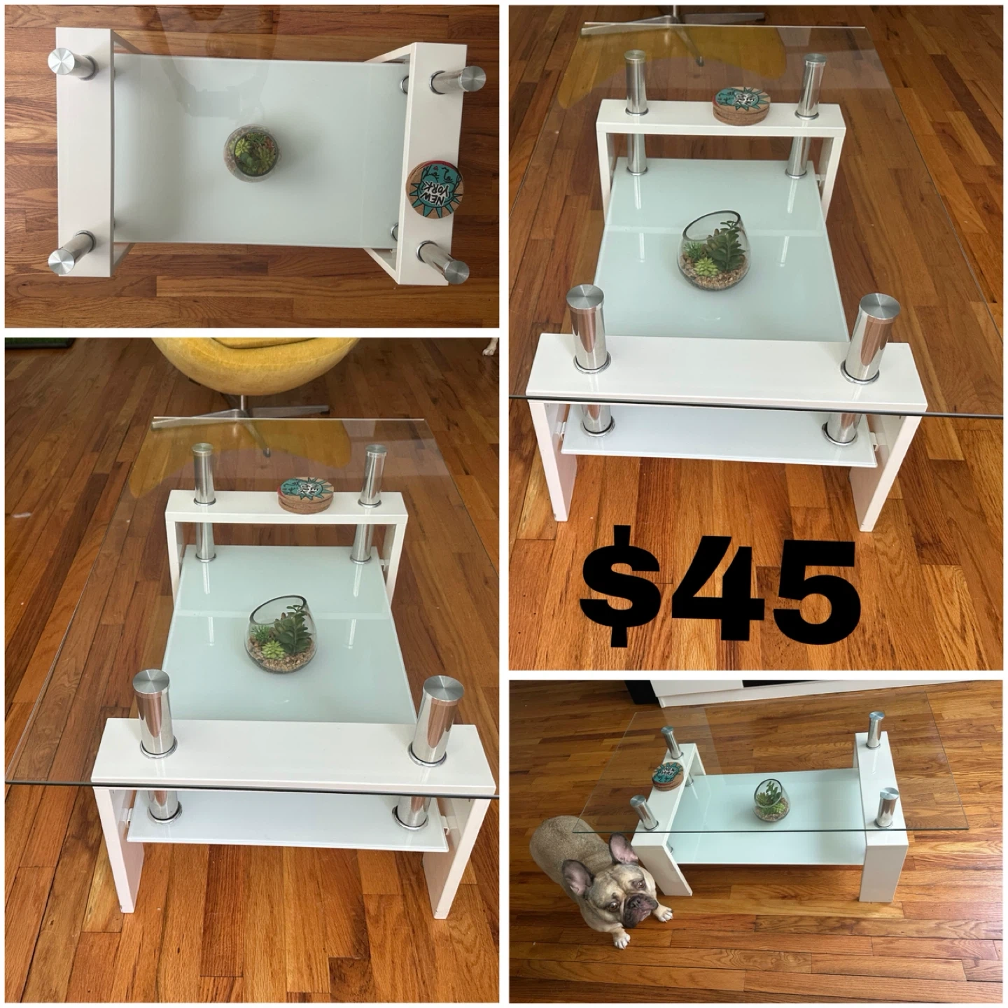 Selling a modern coffee table with a tempered glass top and a white base. The dimensions are 37.4" x 21.7" x 15.7". It's in great condition and would look great in any living room!