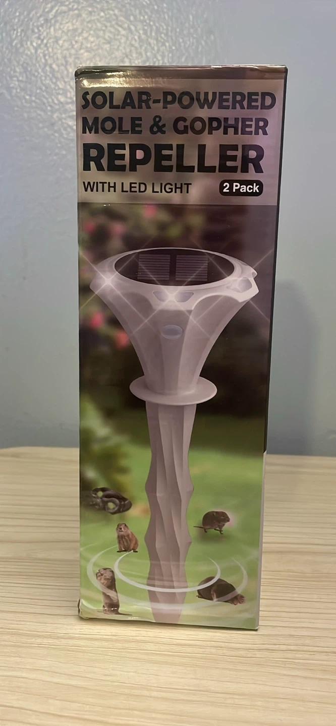 Selling a two-pack of solar-powered mole and gopher repellers with LED lights. Keep your yard pest-free with these easy-to-install devices