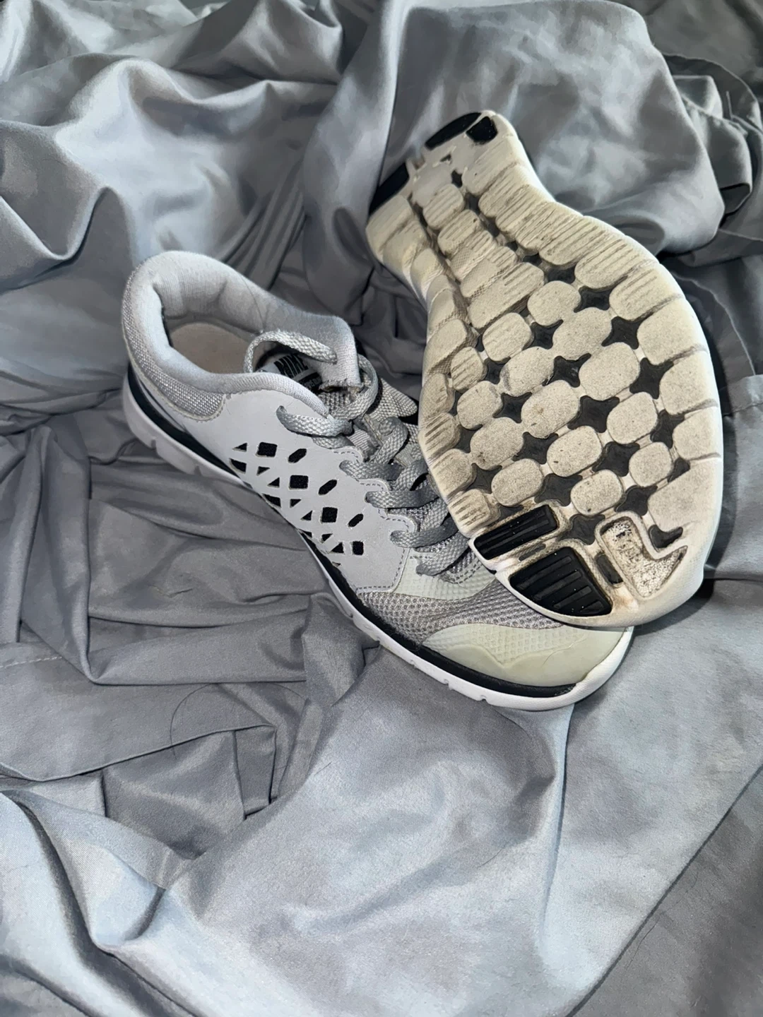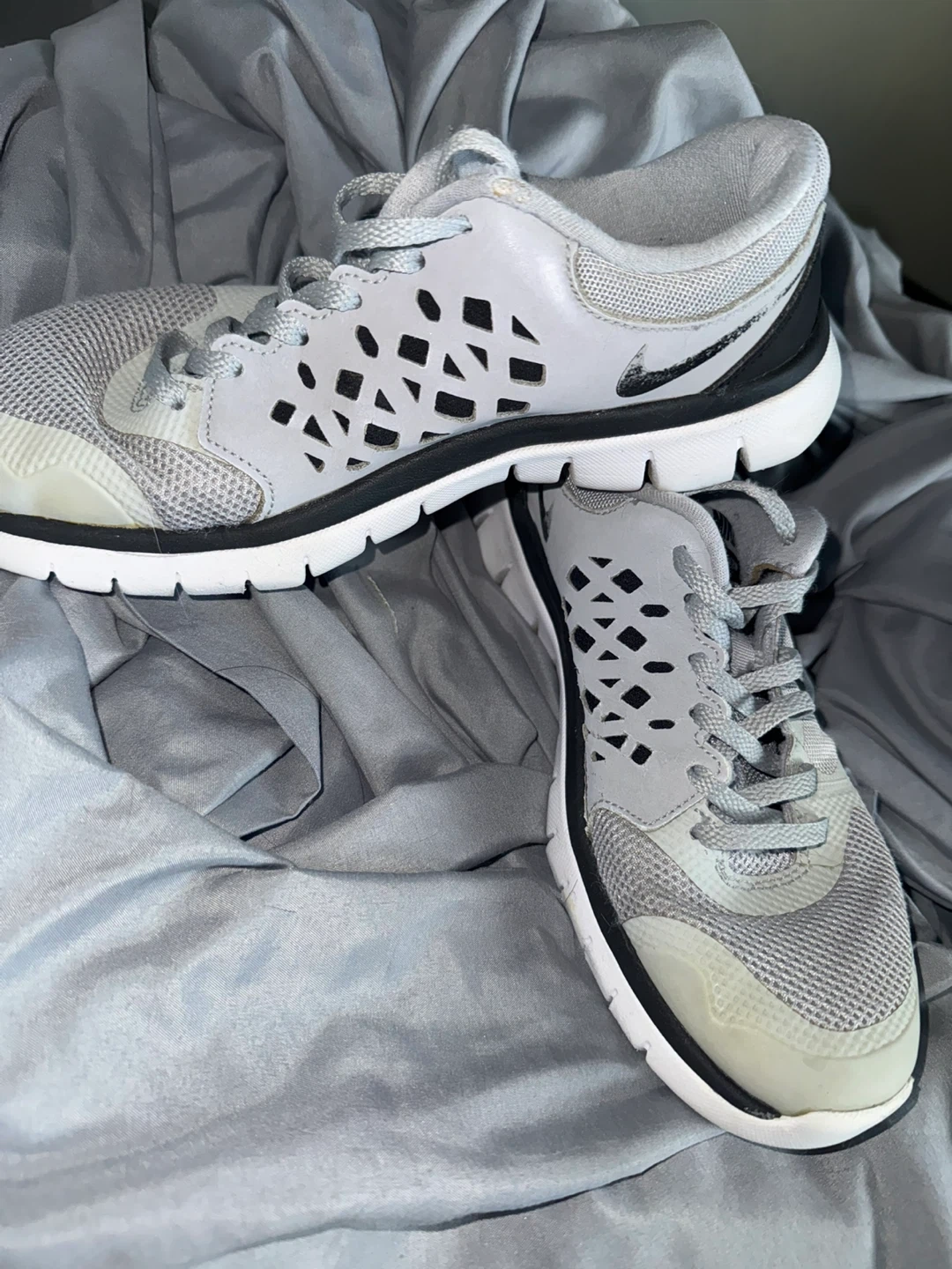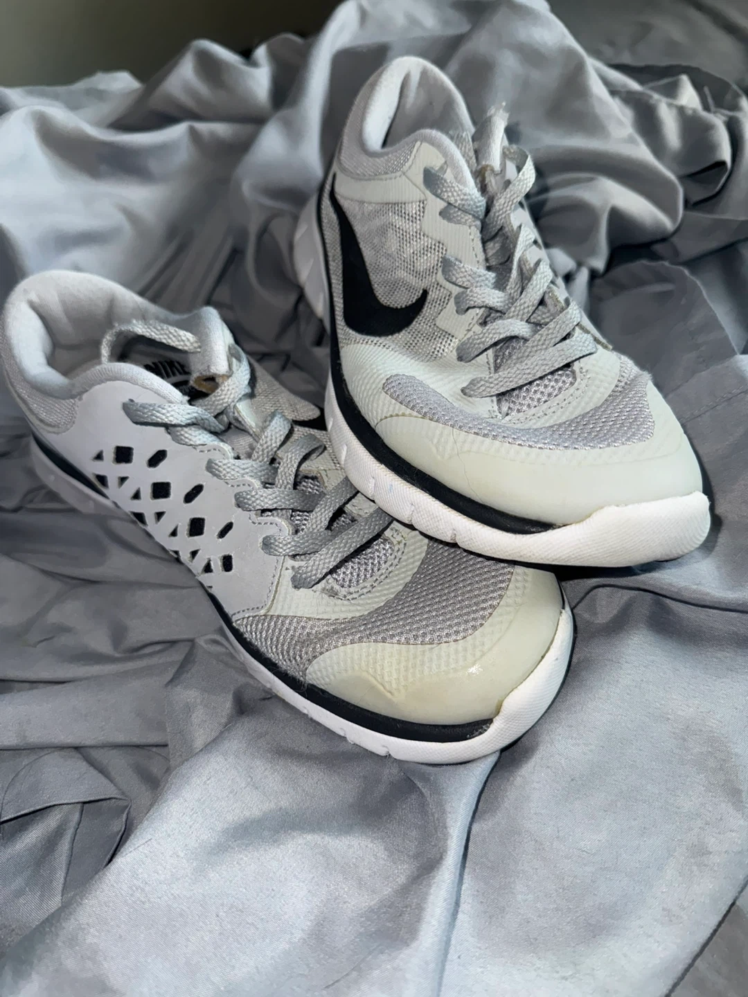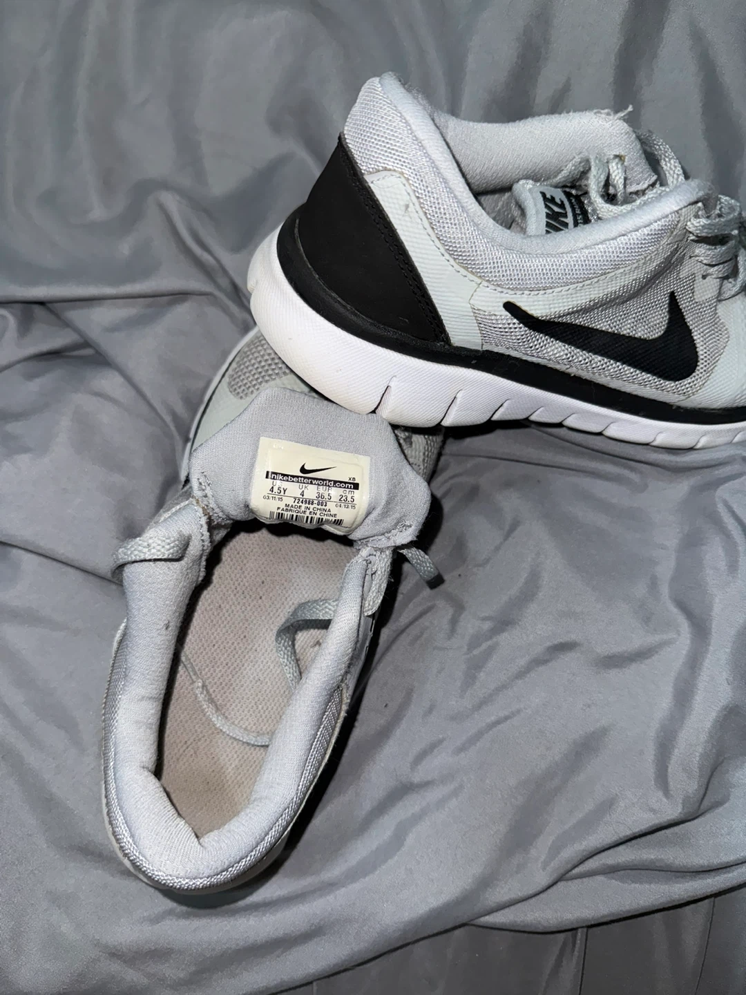 Selling a pair of Nike Flex Experience RN sneakers in size 4.5Y. They are gray and black and have some wear on the soles.