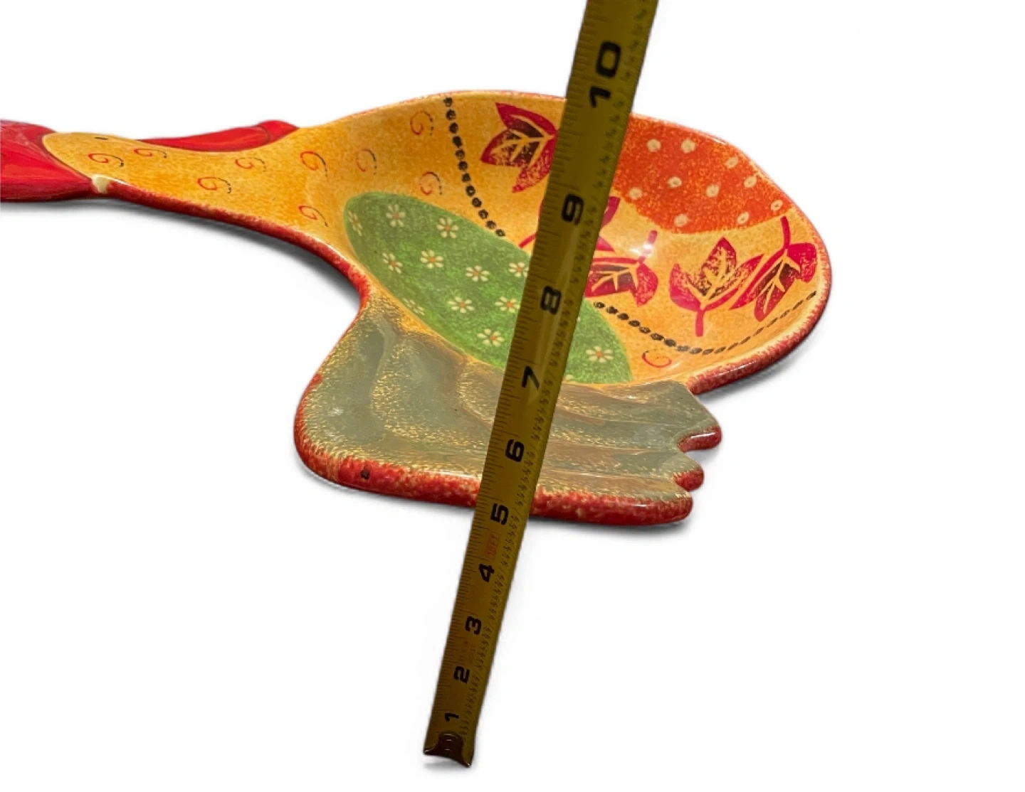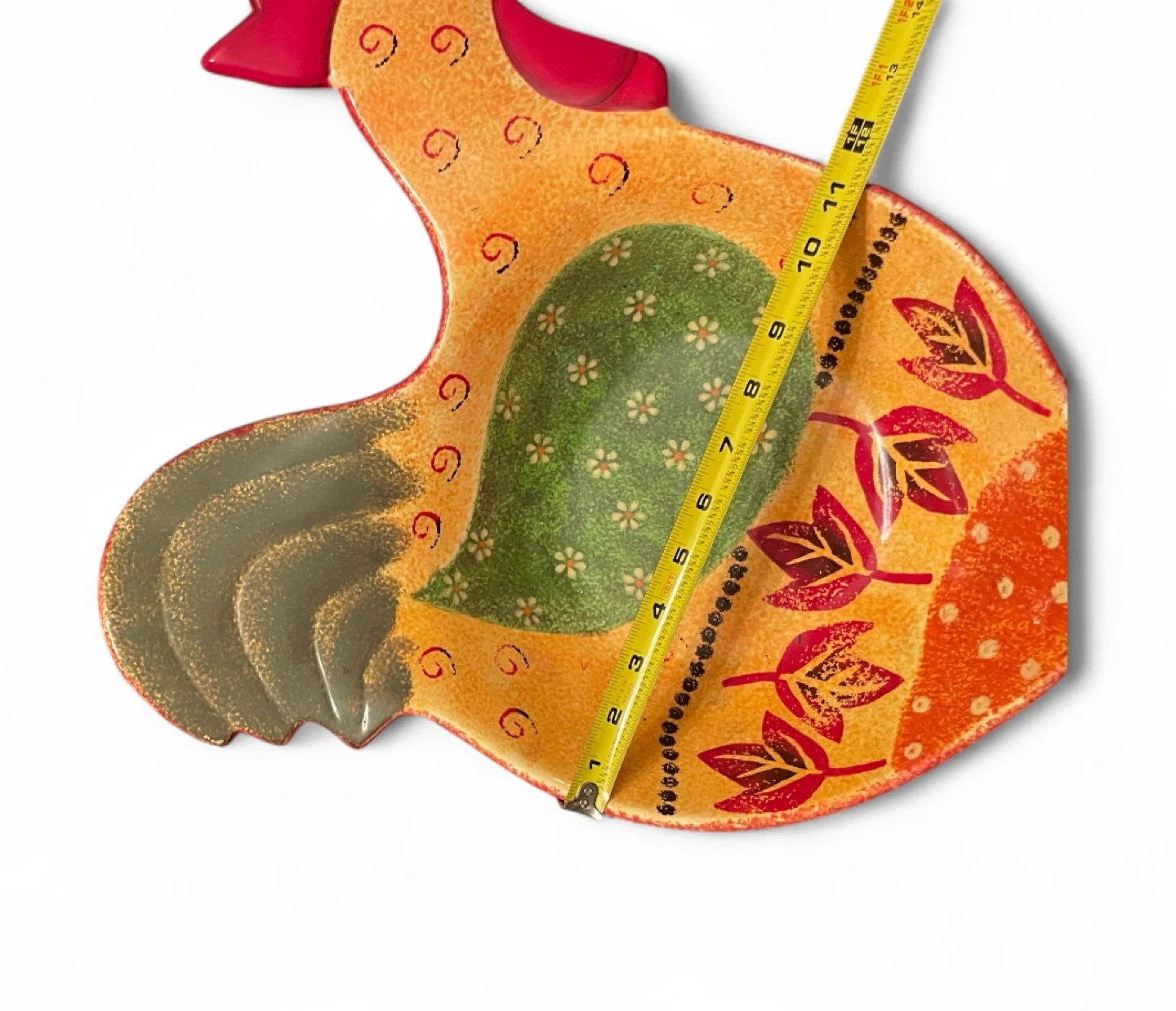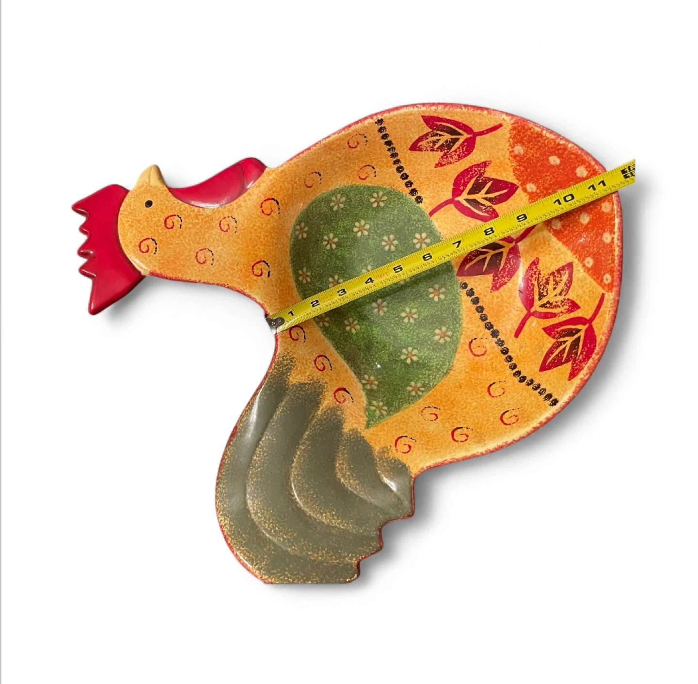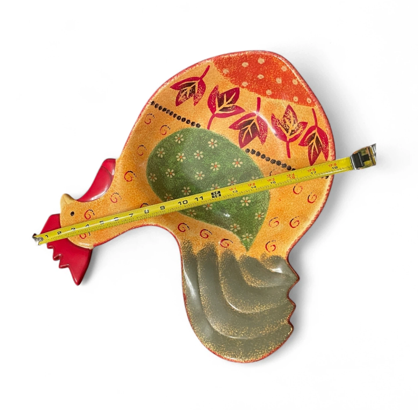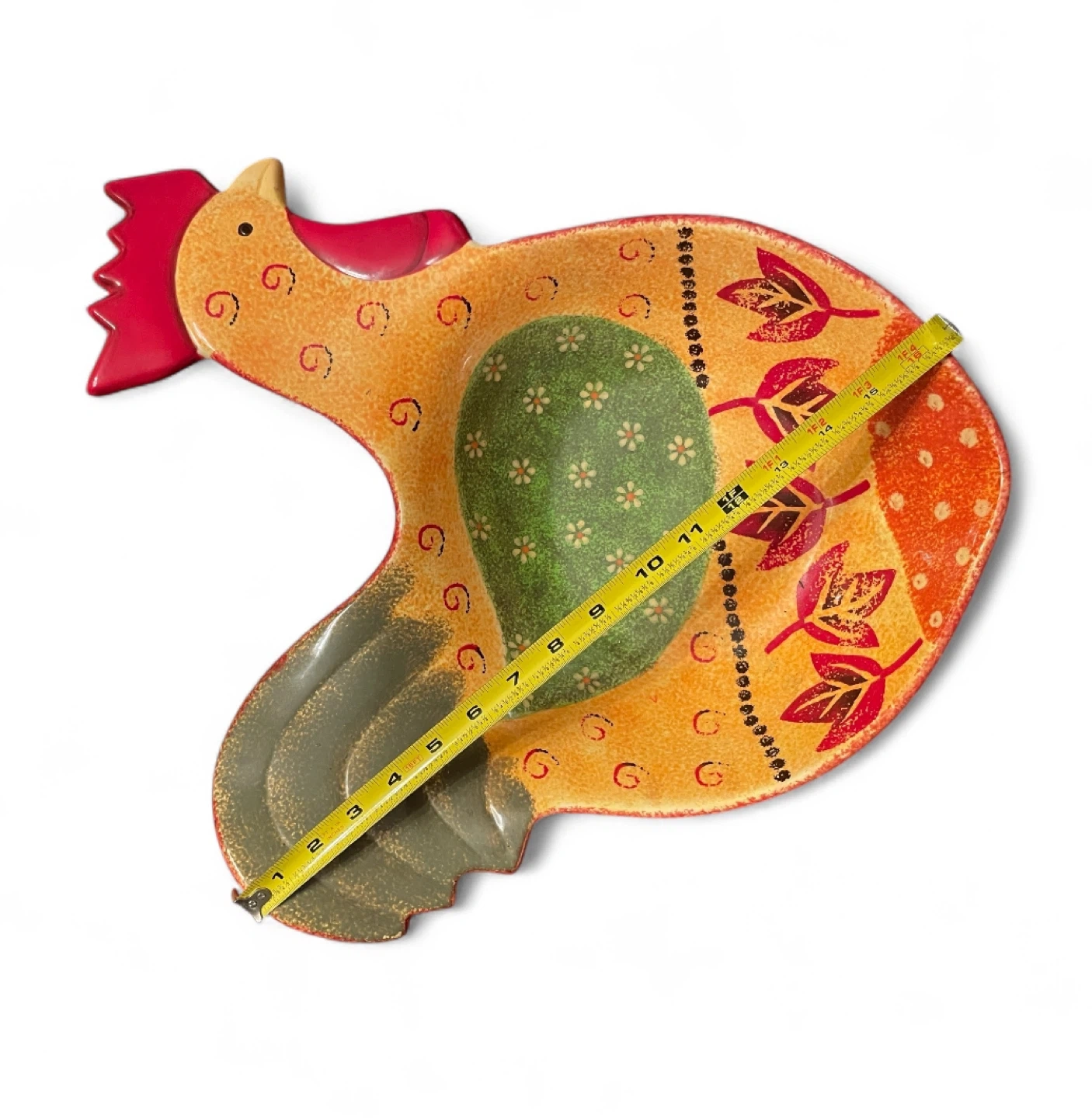 This is a fun, decorative rooster serving bowl dish! It measures about 17 inches in length. It's perfect for adding a touch of whimsy to your kitchen or dining table