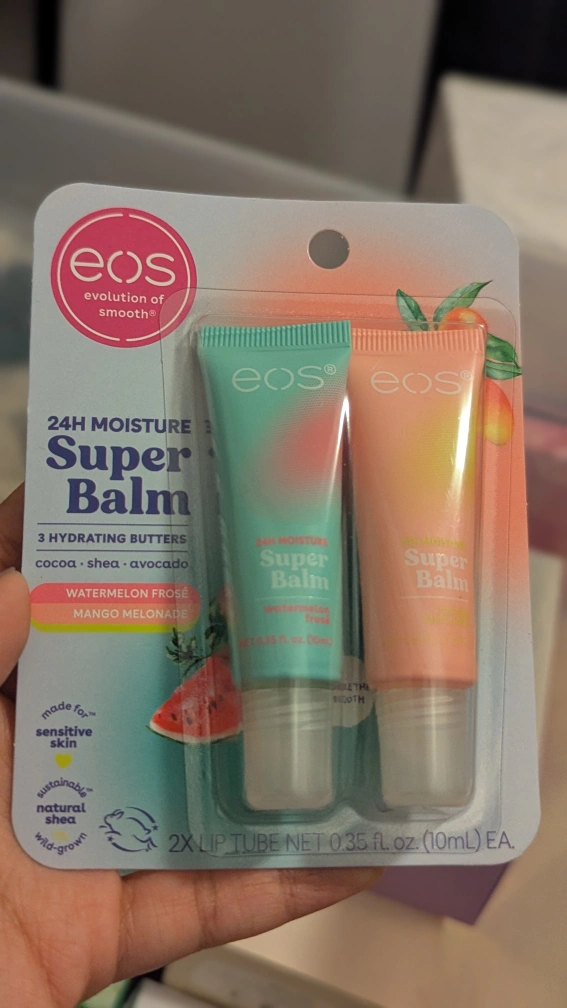 139I'm selling a brand new EOS Super Balm 2-pack! This duo includes Watermelon Frosé and Mango Melonade flavors. They provide 24-hour moisture and are made with 3 hydrating butters: cocoa, shea, and avocado. Perfect for sensitive skin and made with sustainable natural shea. Each lip tube contains 0.35 fl oz (10mL). The original packaging is included. $5 each or $10 for both