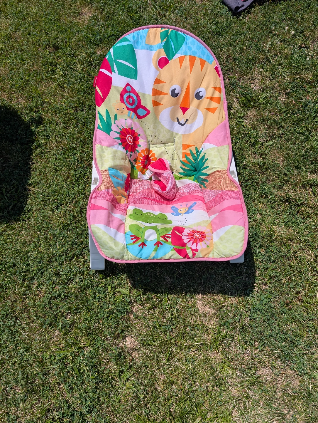 Selling a Fisher-Price baby bouncer seat! It's in good condition and features a colorful design with a tiger, butterfly, and other cute animals and plants. Perfect for keeping your little one entertained and comfortable.