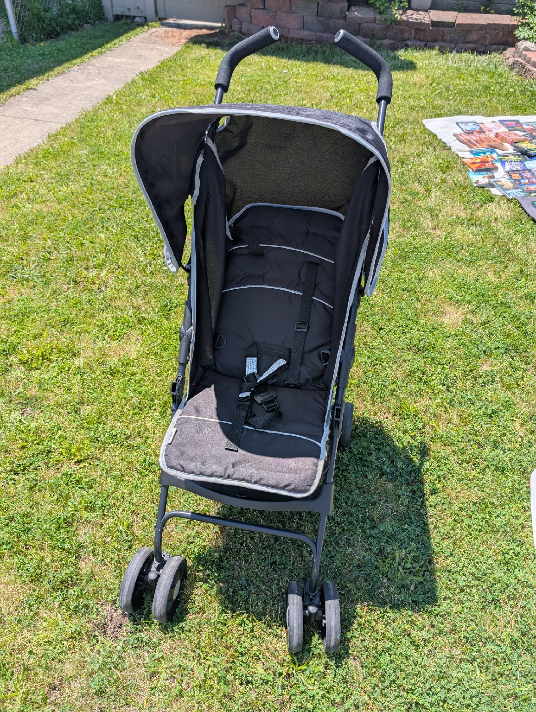 Selling a gently used black umbrella stroller. It's lightweight and easy to fold, making it perfect for travel or quick trips. The stroller is in good condition and ready for its next little passenger!