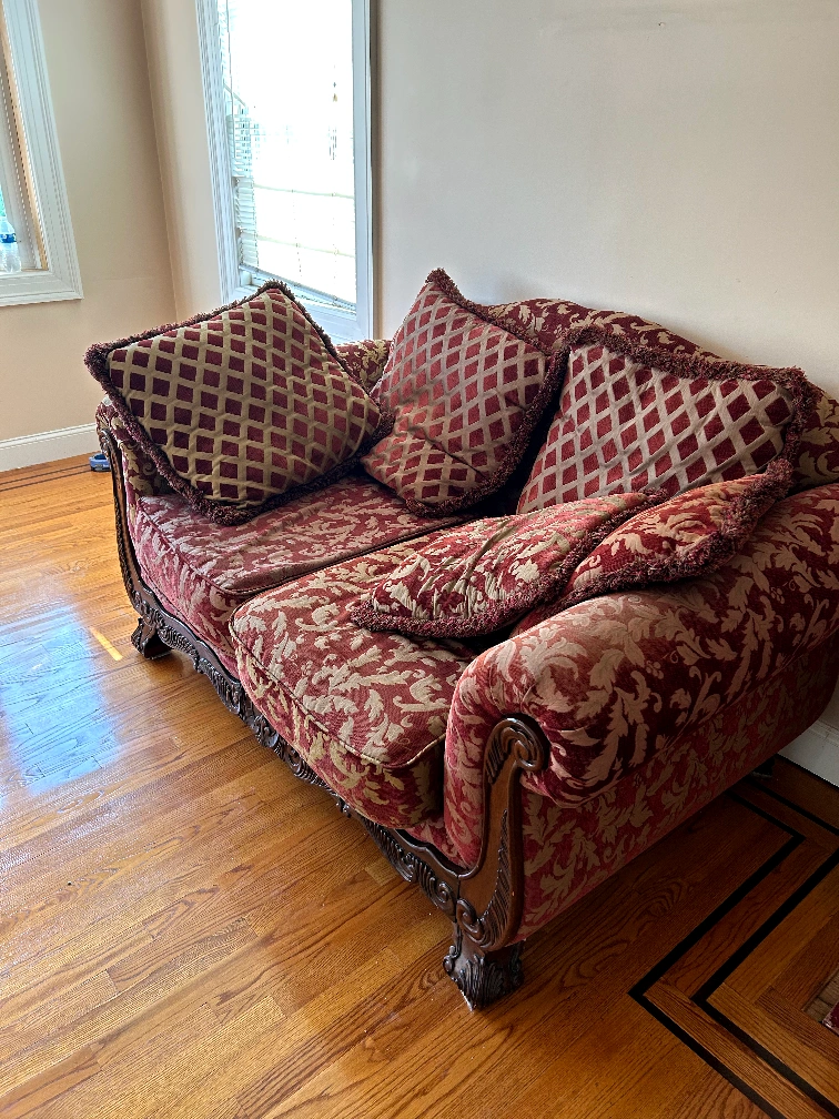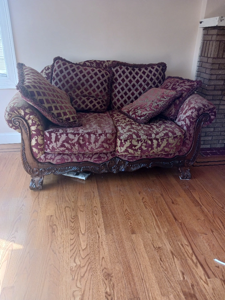 Selling a beautiful burgundy loveseat sofa that would look great in any living room! It comes with several matching pillows to complete the look. The sofa has a unique design with ornate wooden details. It's in good condition and ready for a new home