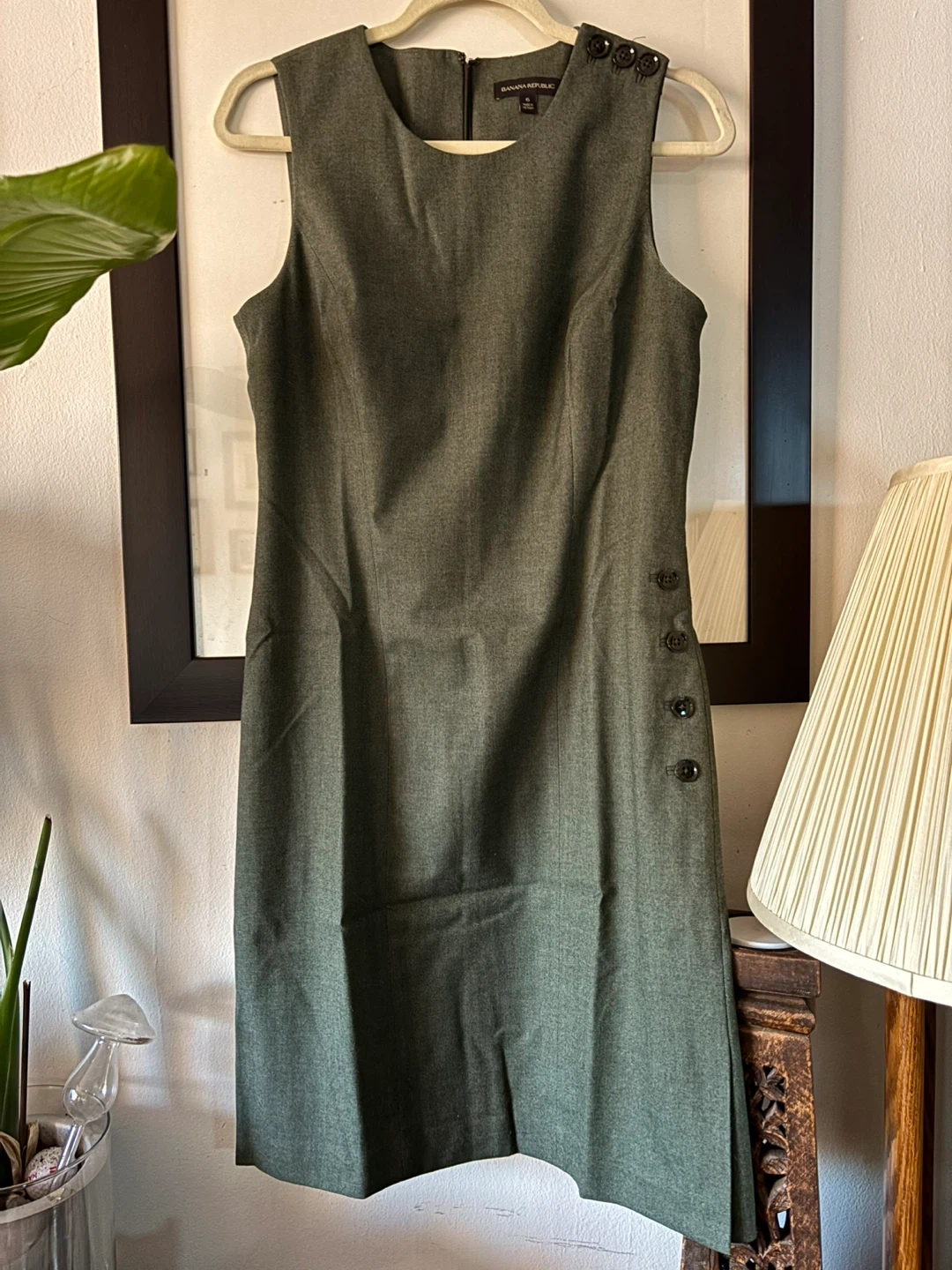 Selling a Banana Republic dress in olive green, size 6. It's a sleeveless dress with button details. Great for work or a night out!