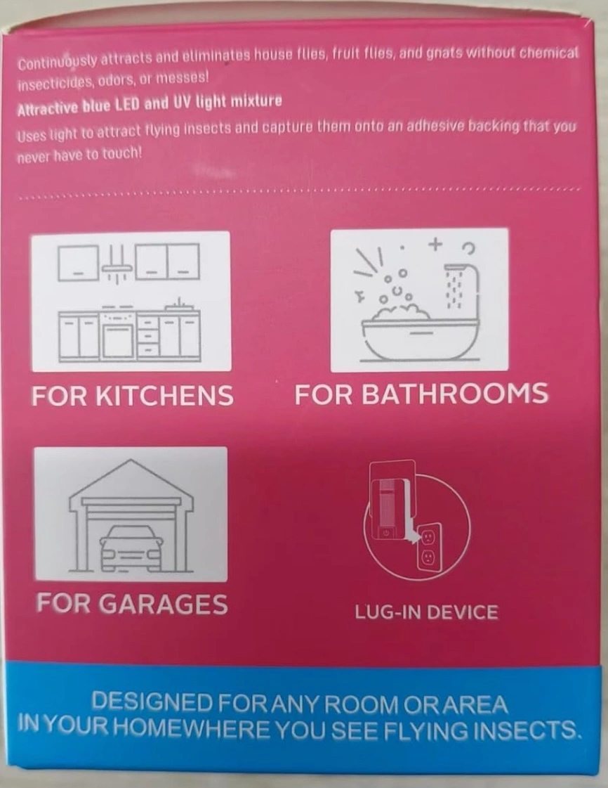 86I'm selling a brand new flying insect trap! It's designed for any room or area in your home where you see flying insects. It continuously attracts and eliminates house flies, fruit flies, and gnats without chemical insecticides, odors, or messes! Uses tight to attract flying insects and capture them onto an adhesive backing that you never have to touch! It has an attractive blue LED and UV light mixture. It is designed for kitchens, bathrooms, and garages. It is a lug-in device and comes in the original box