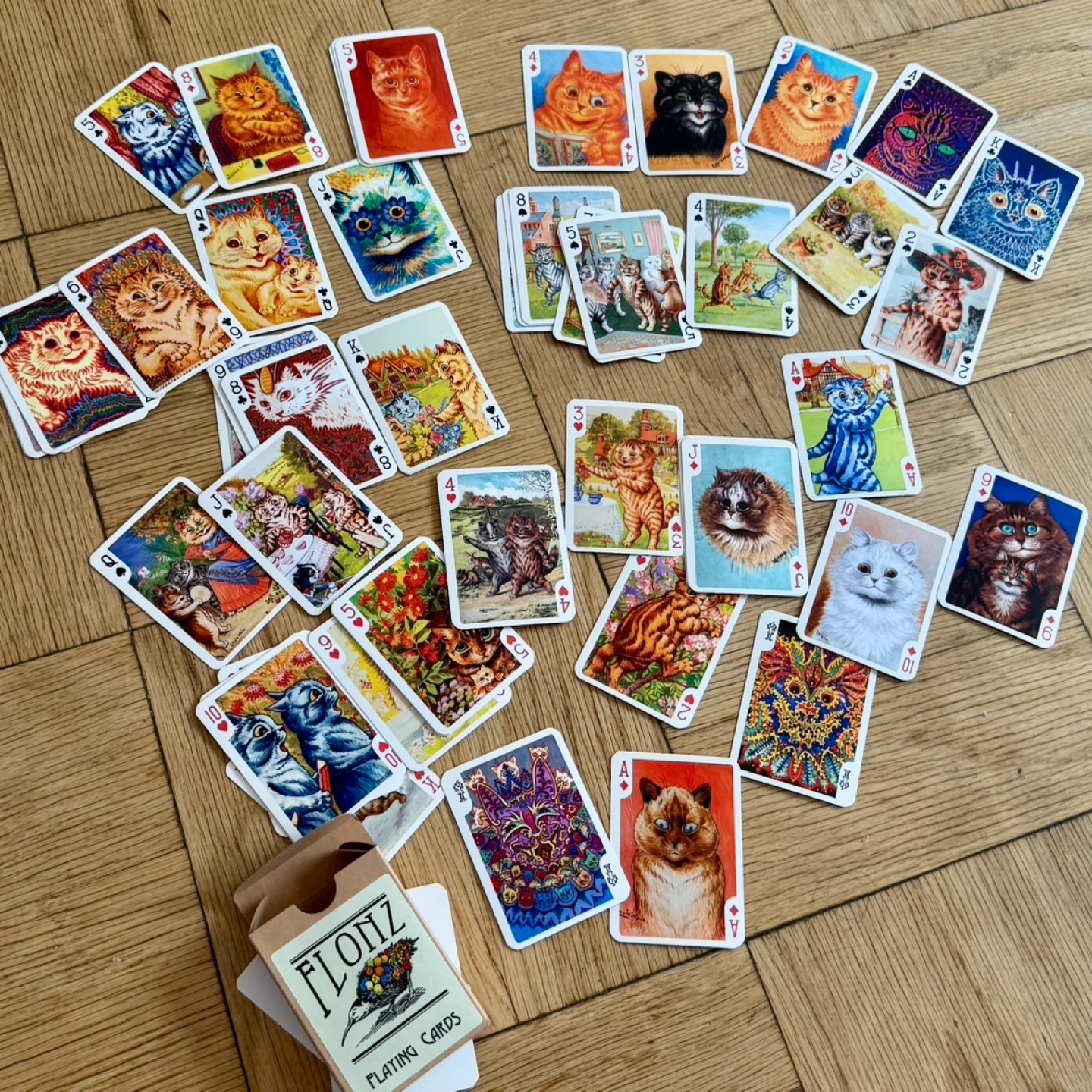 Selling a deck of Flonz playing cards featuring adorable cat illustrations by Louis Wain! The cards are in new condition and come with the original box. Perfect for cat lovers and card game enthusiasts alike.