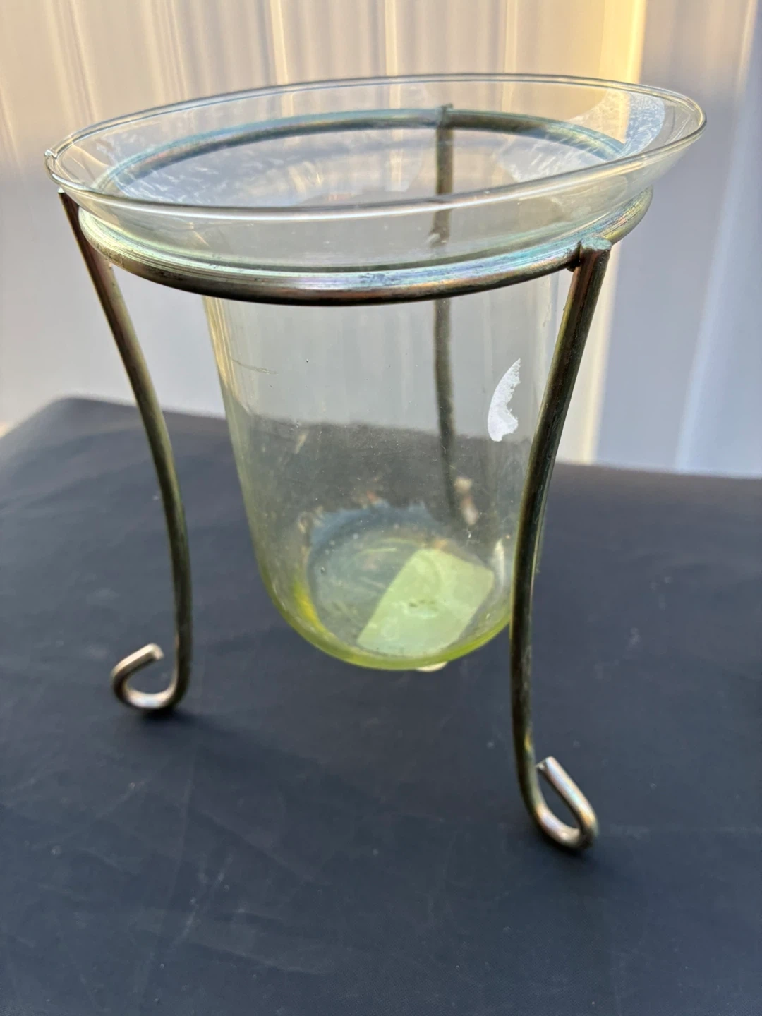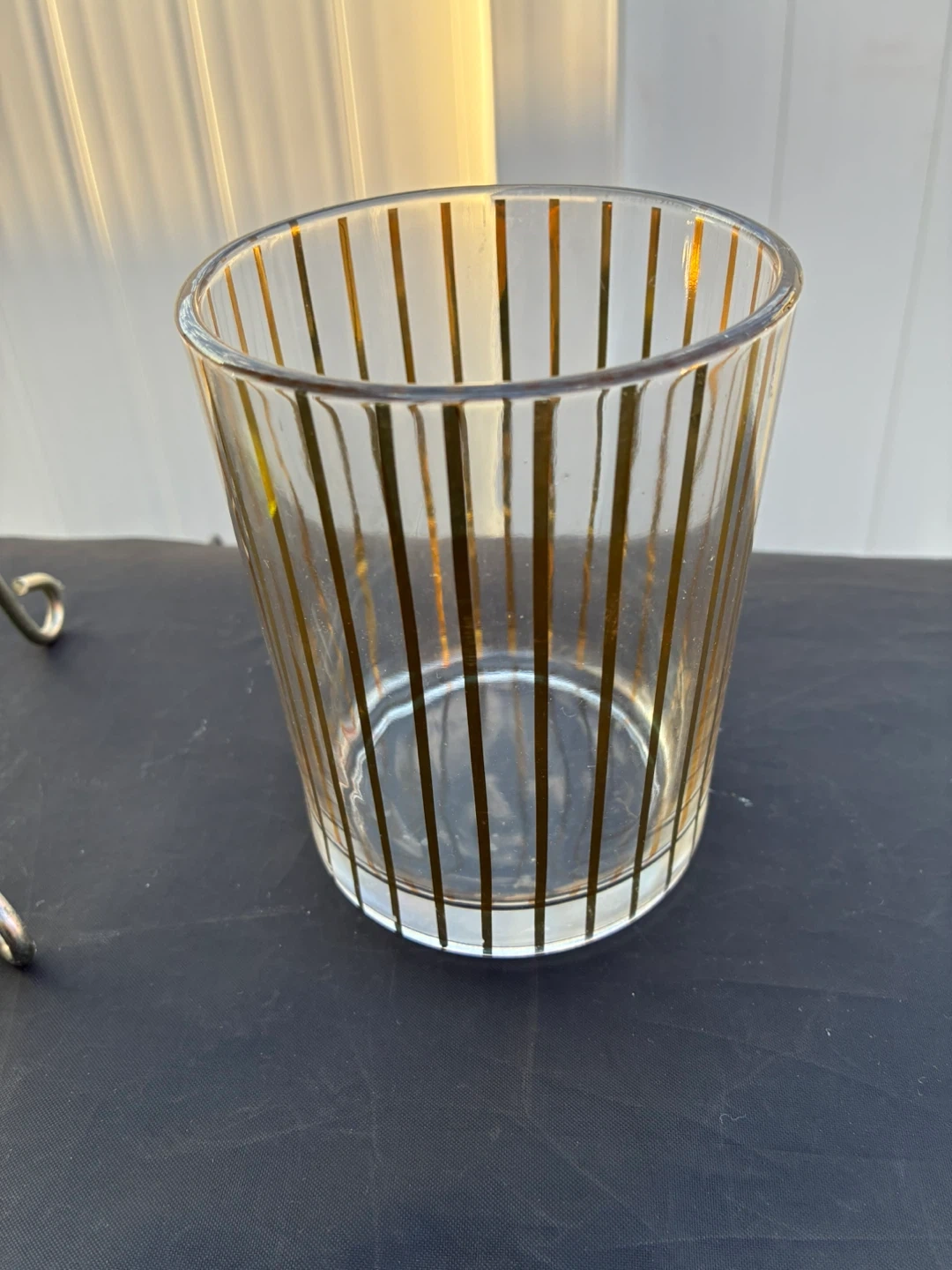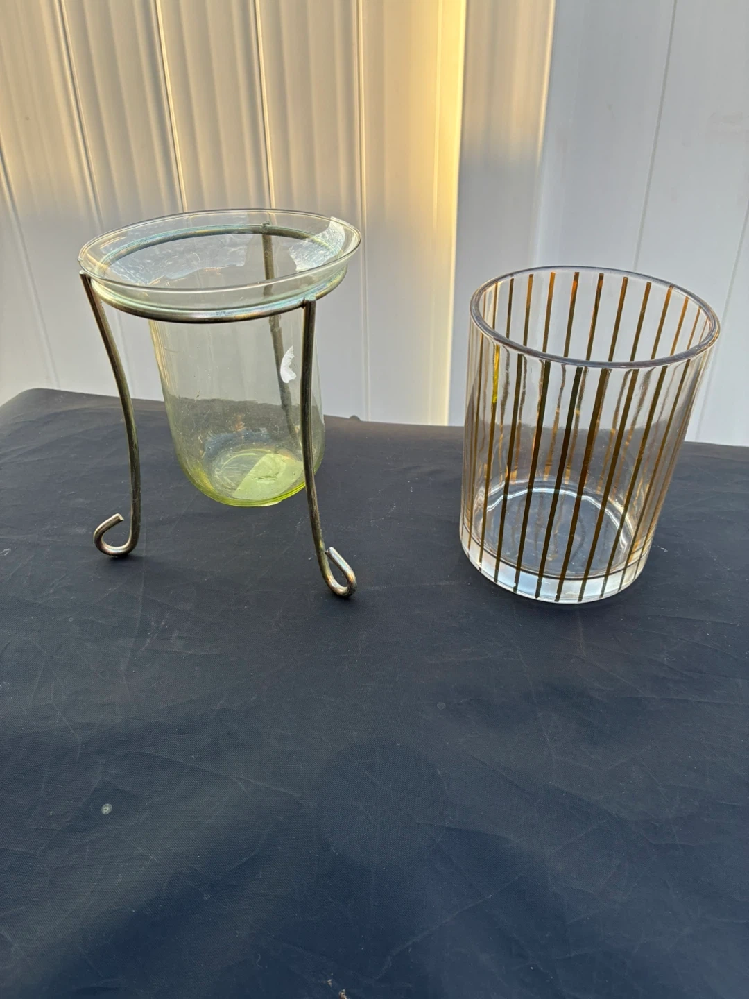 Gold Striped Glass Vase & Metal Stand Selling a clear glass vase with gold vertical stripes. And another one with a metal stand. Perfect for displaying flowers or as a decorative piece! Pick up in Norridge Price $5 ea