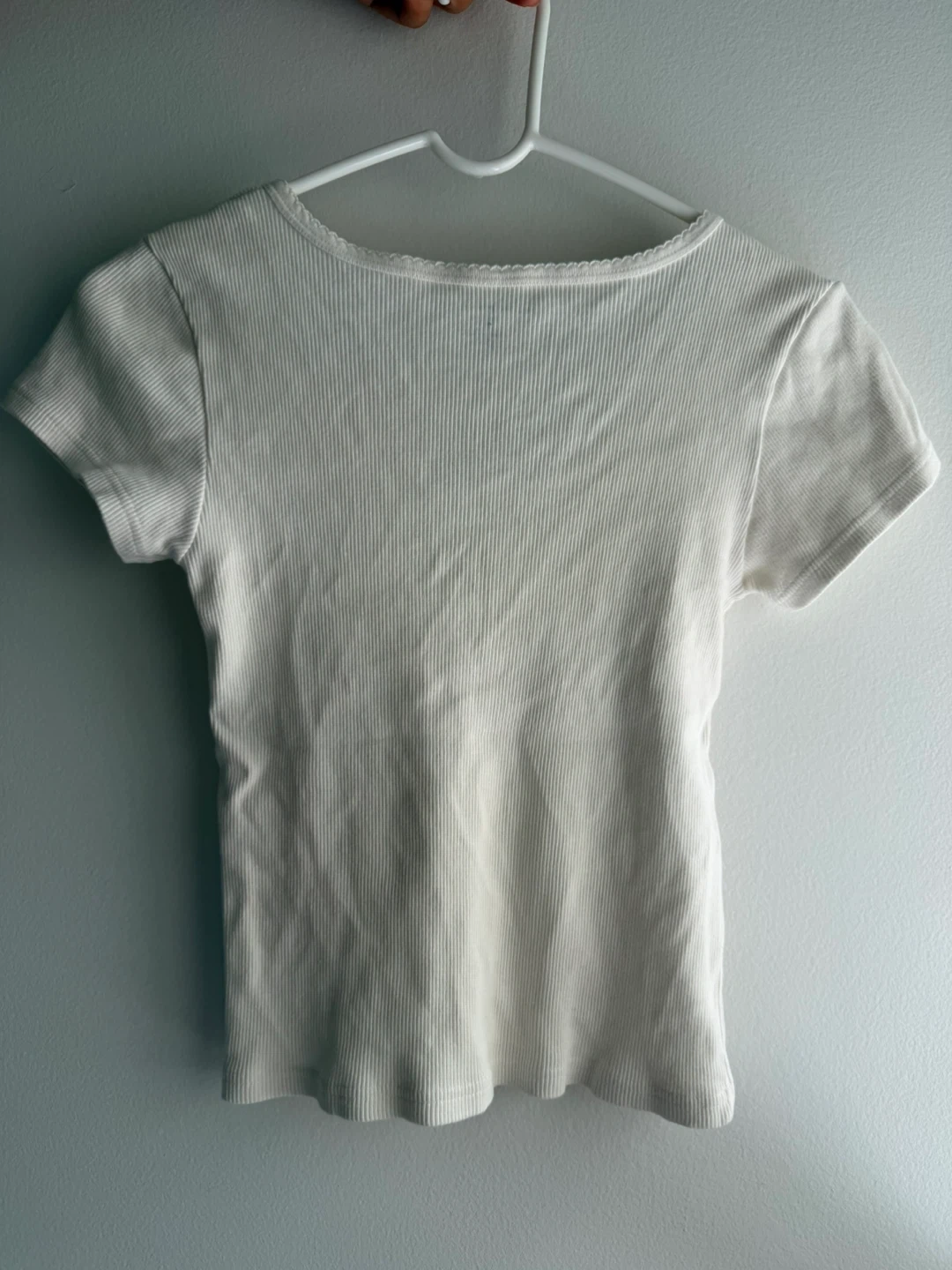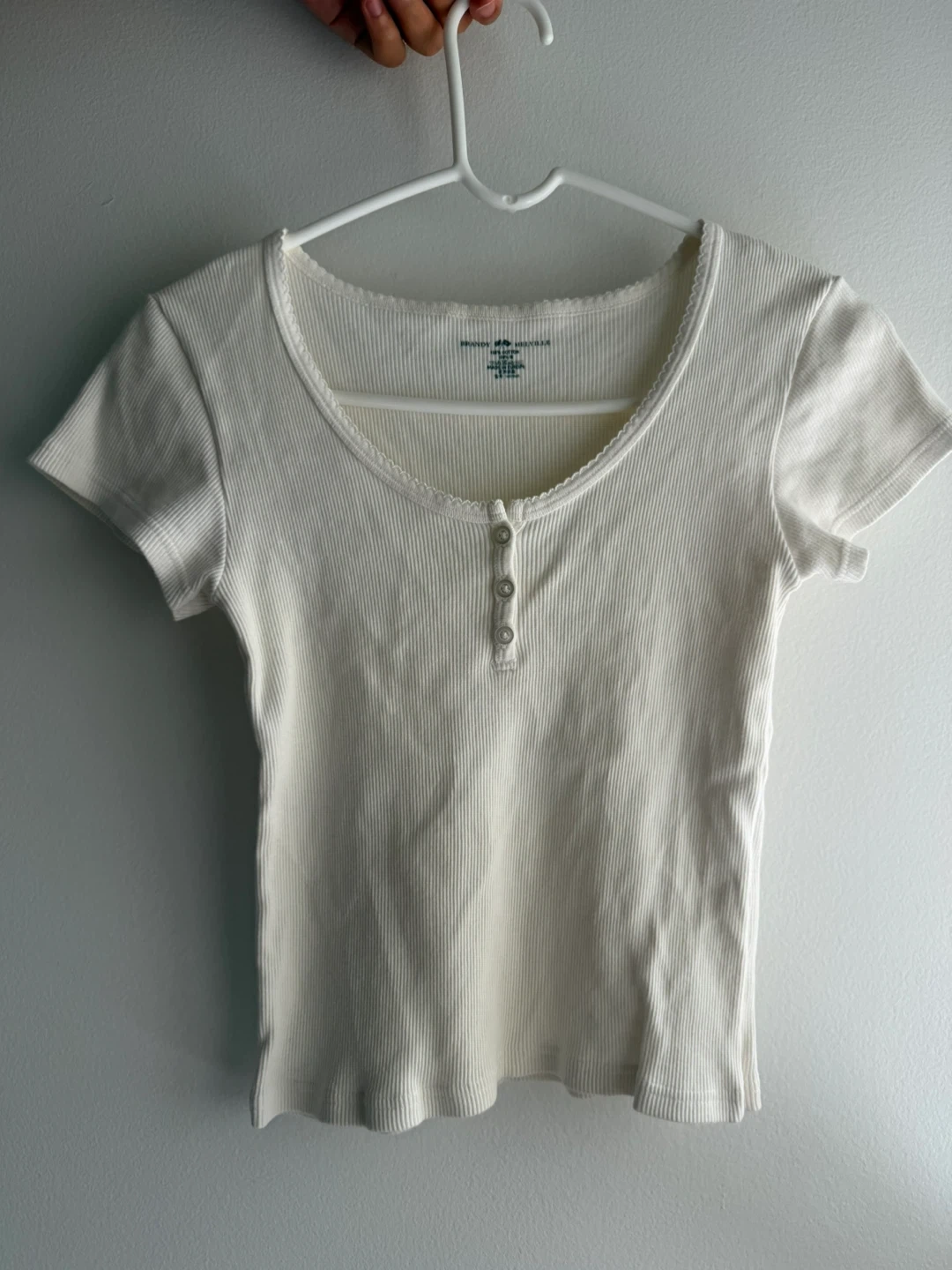 65Here's a cute Brandy Melville cream white-colored ribbed henley top! It's in great condition and ready for a new home. The material is soft and comfortable, perfect for everyday wear