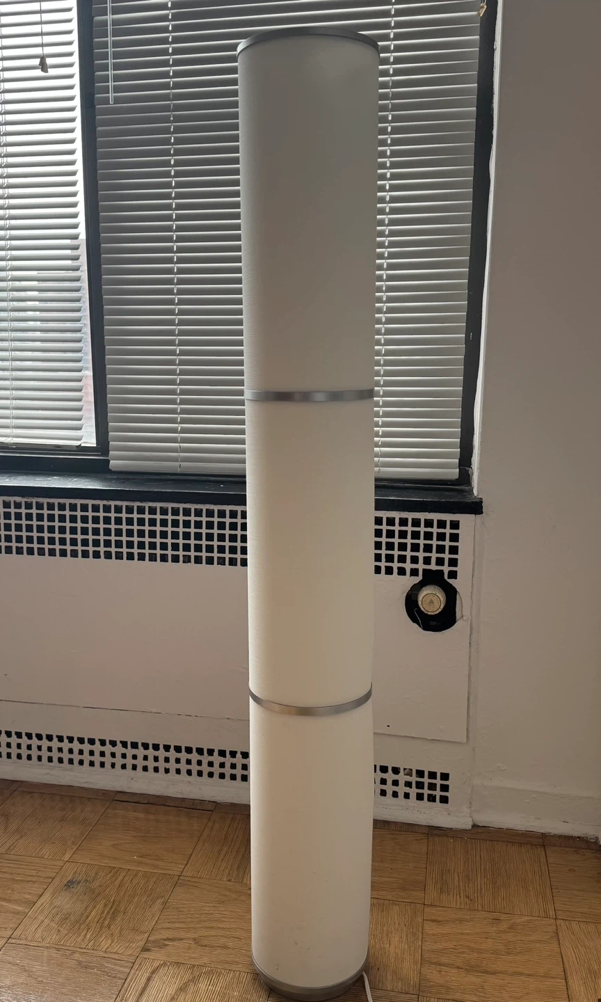 Selling 3 identical modern floor lamps with a cylindrical design. Each features a white fabric shade and metal accents. This lamp would be a great addition to any living room, bedroom, or office space! All come with working light bulbs.
