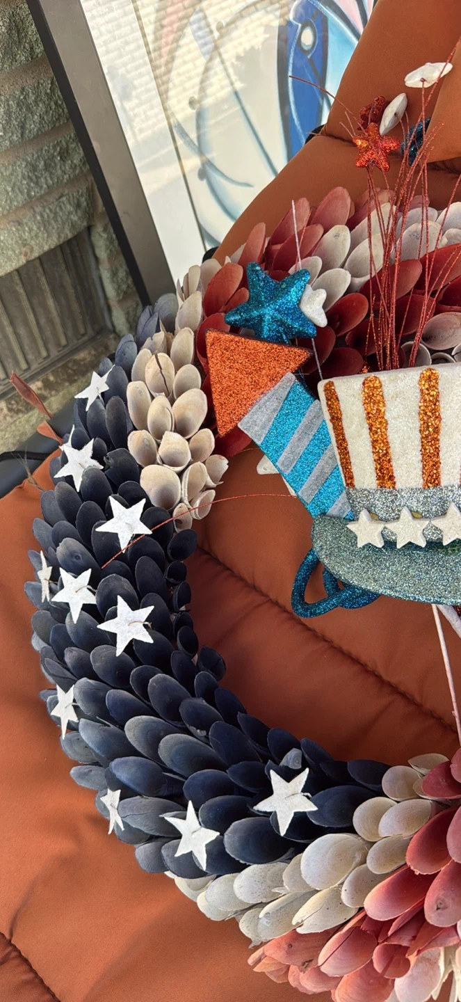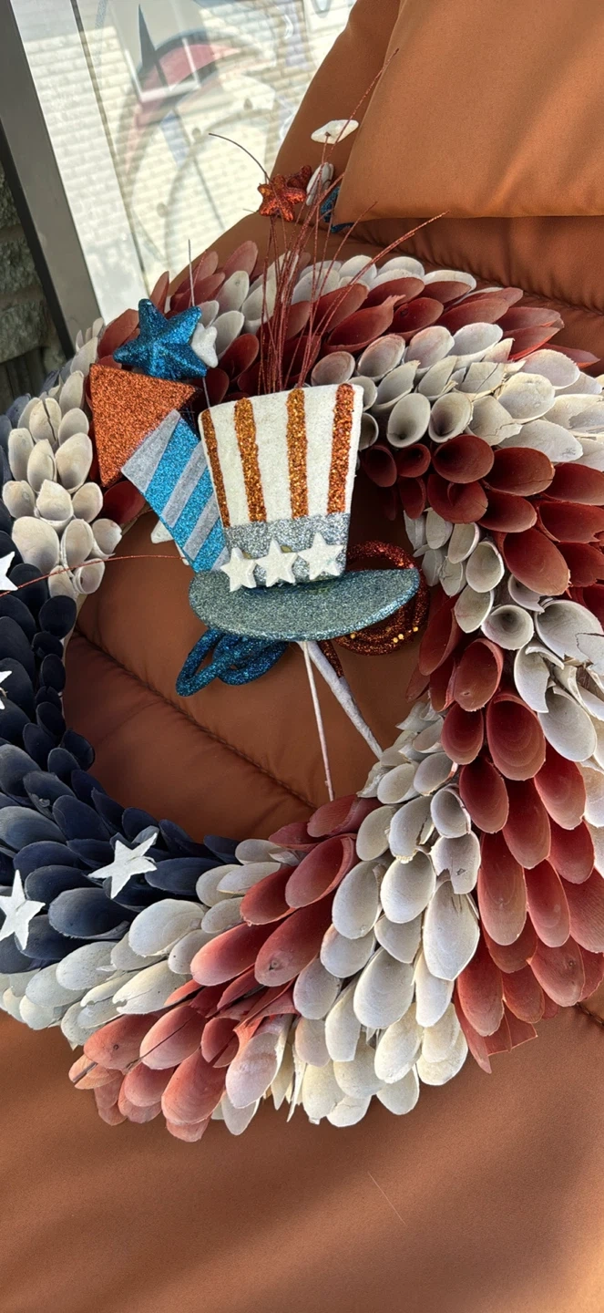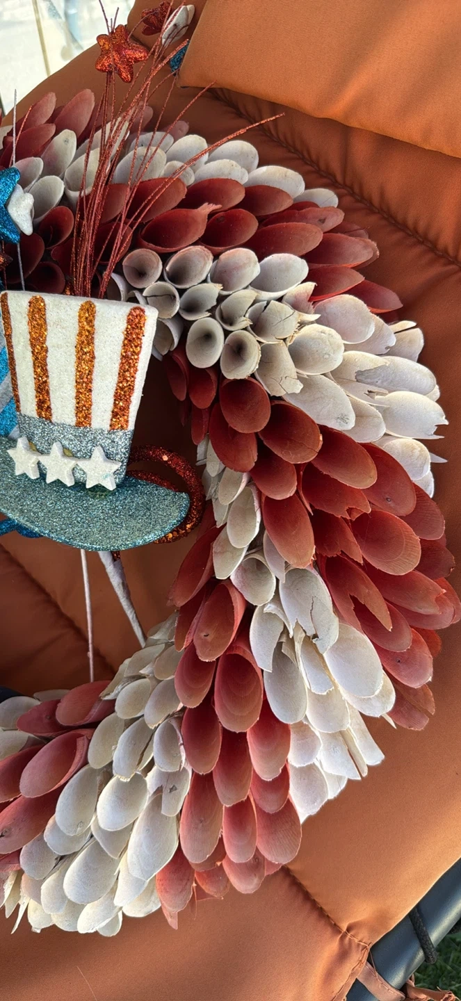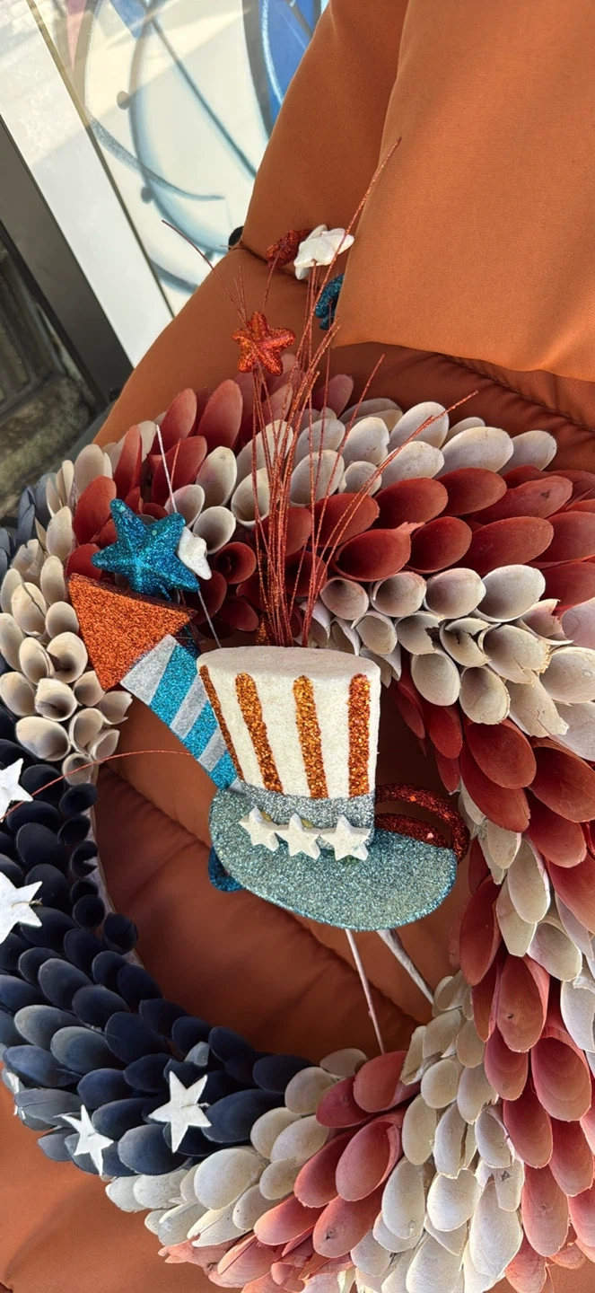 This is a patriotic wreath made of painted spoons in red, white, and blue. It has a cute Uncle Sam hat in the middle and is perfect for the 4th of July