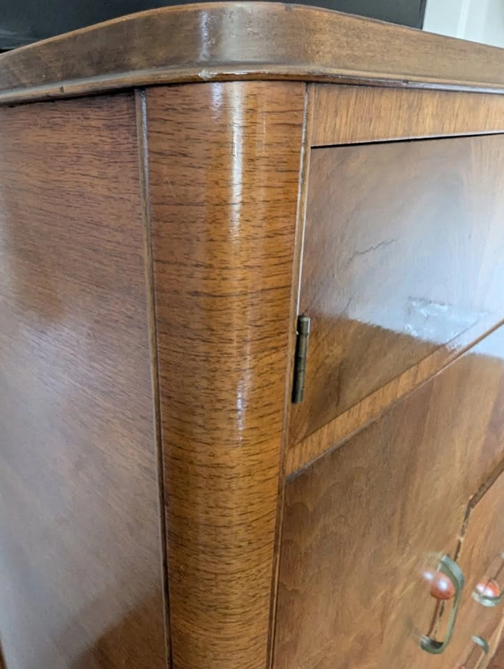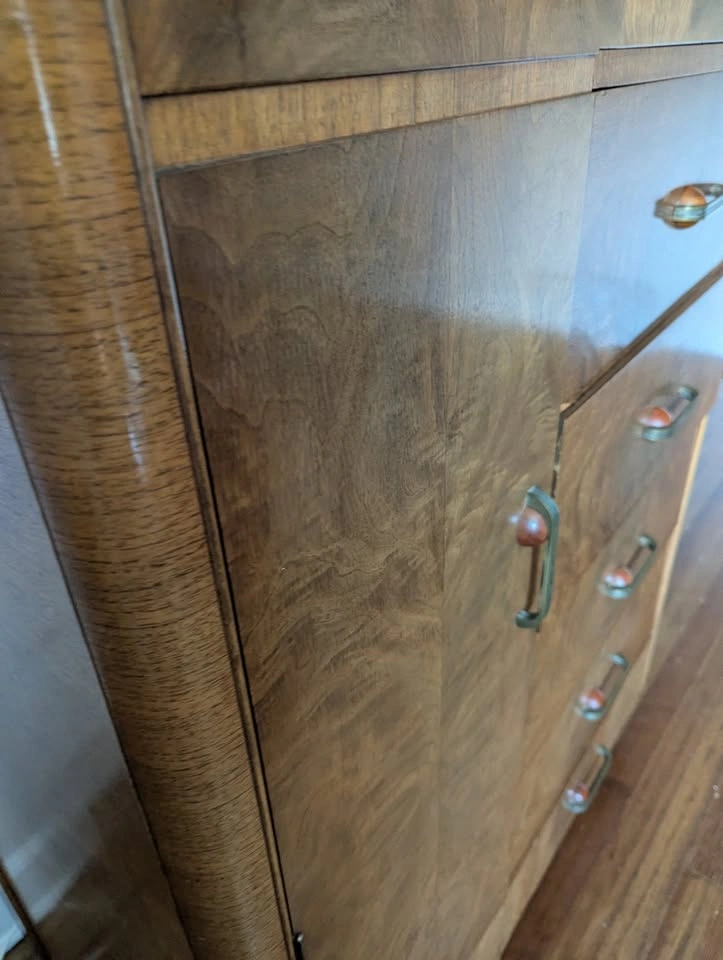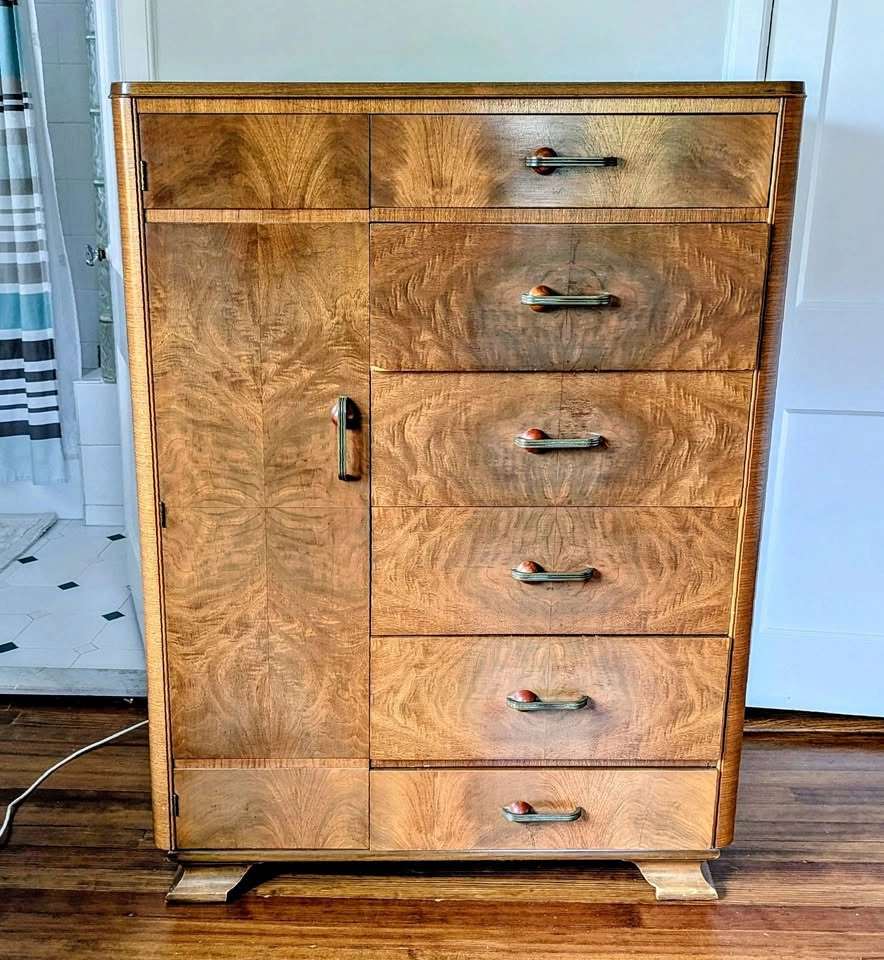 Solid Antique Wood Art Decco Armoire Dresser Closet Waterfall. Dimensions: Width: 38", Height: 52", Depth: 21". Pick up is in New Fairfield, CT. We are focused in selling high quality used furniture! All furniture is carefully inspected for mold and lead — safety is our priority. Drawers and hardware are checked to ensure everything functions smoothly. Interiors are cleaned and waxed, so your dresser arrives fresh, smooth, and ready to enjoy. We believe everyone — and everything — deserves a second chance. Every piece we restore has a history, and we’re here to preserve its story and help it find a new home. Support sustainability by choosing thoughtfully refinished furniture built to last. Feel free to message if you have any questions!