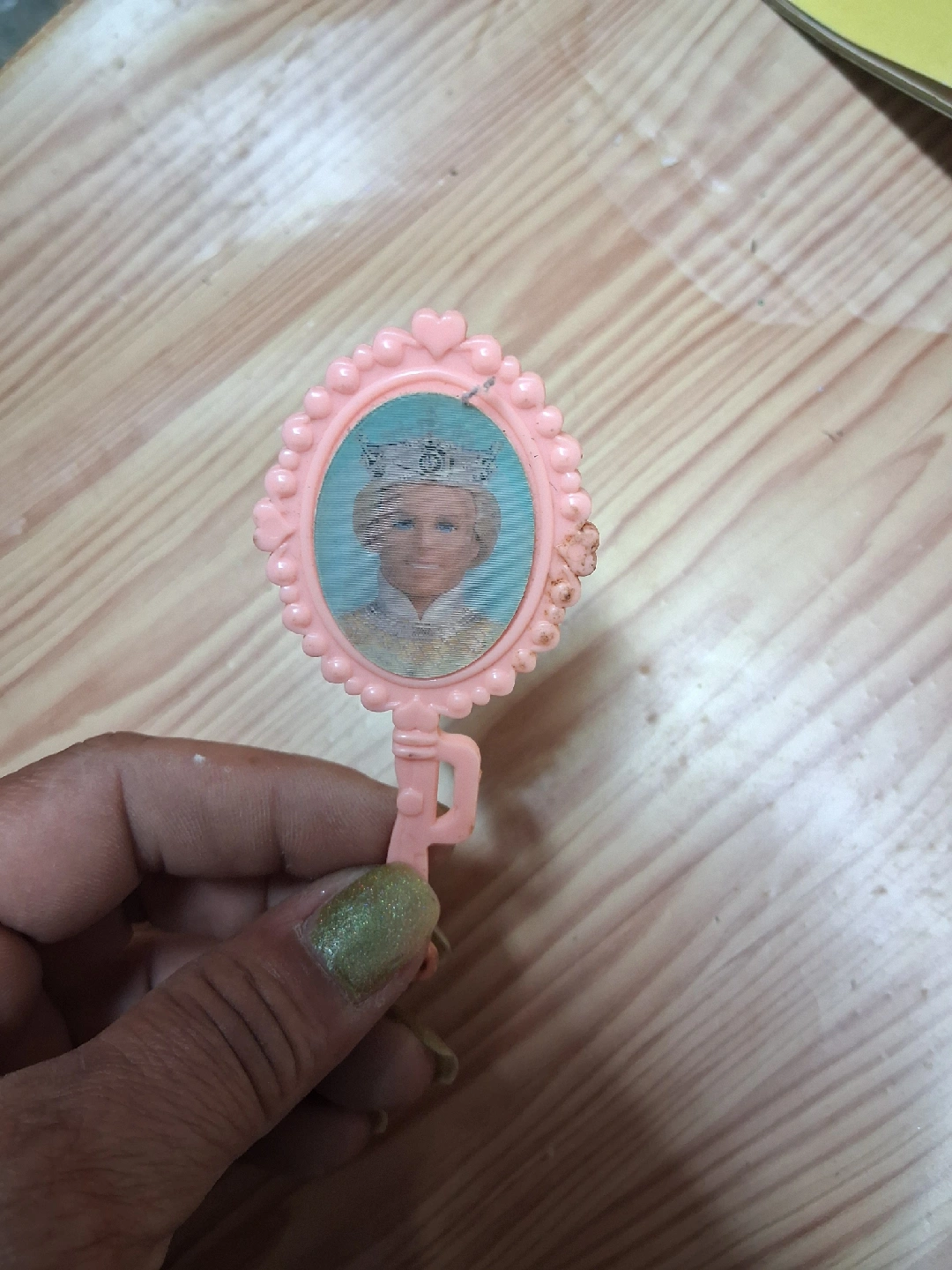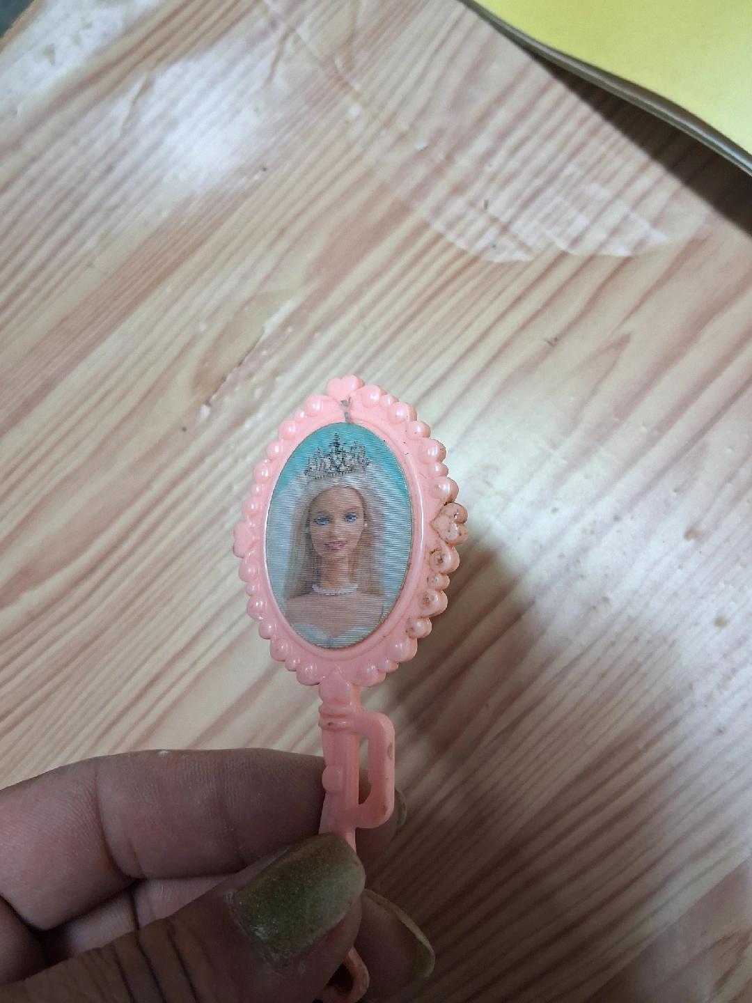 Selling a miniature vintage Barbie hand mirror. It's a cute, pink, oval-shaped mirror with a picture of Barbie as a princess. It shows some signs of wear but still has a lot of charm