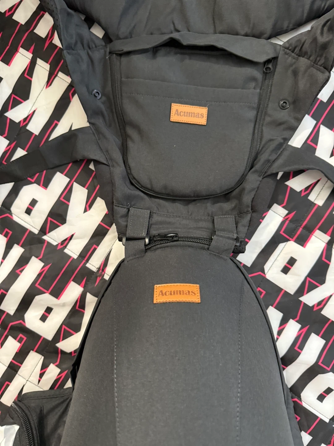 I'm selling a black Acumas baby carrier. It's a 6-in-1 design suitable for newborns to toddlers. This carrier is adjustable and suitable for all seasons. It also features a hip seat for added comfort and support!