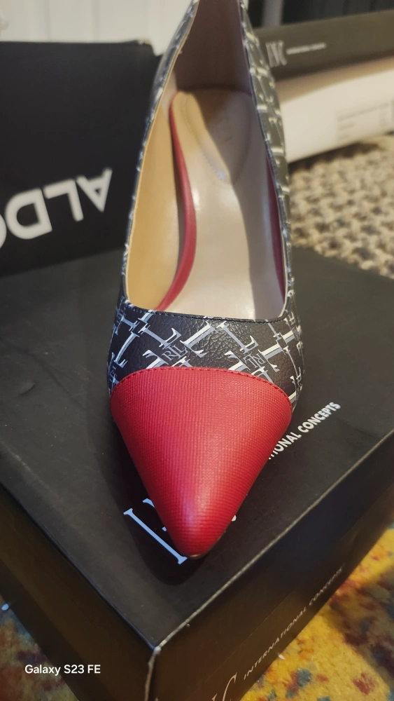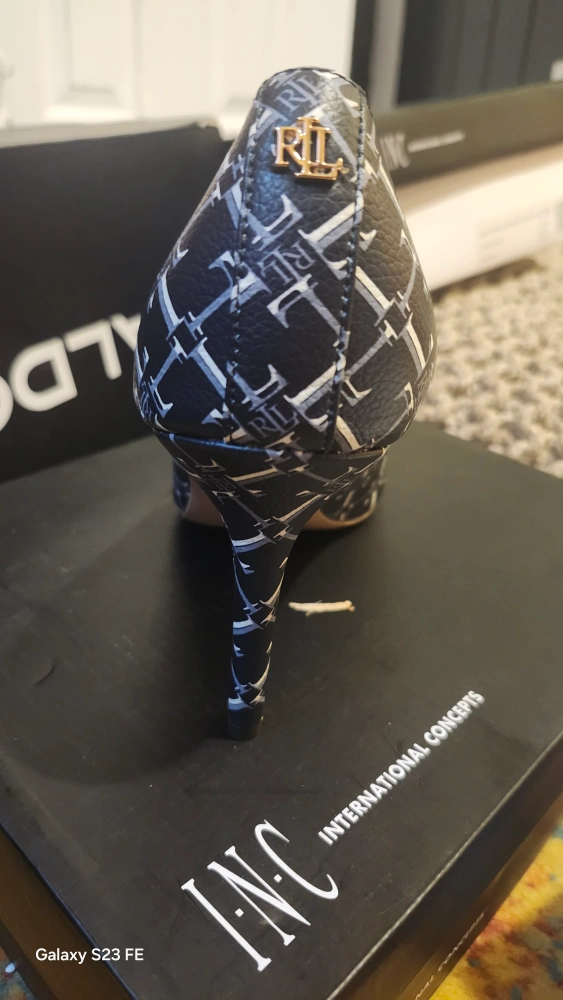 76Selling a pair of Ralph Lauren heels in size 10M They feature a black and white RL logo pattern and a red toe. They are in good condition and ready for a new home