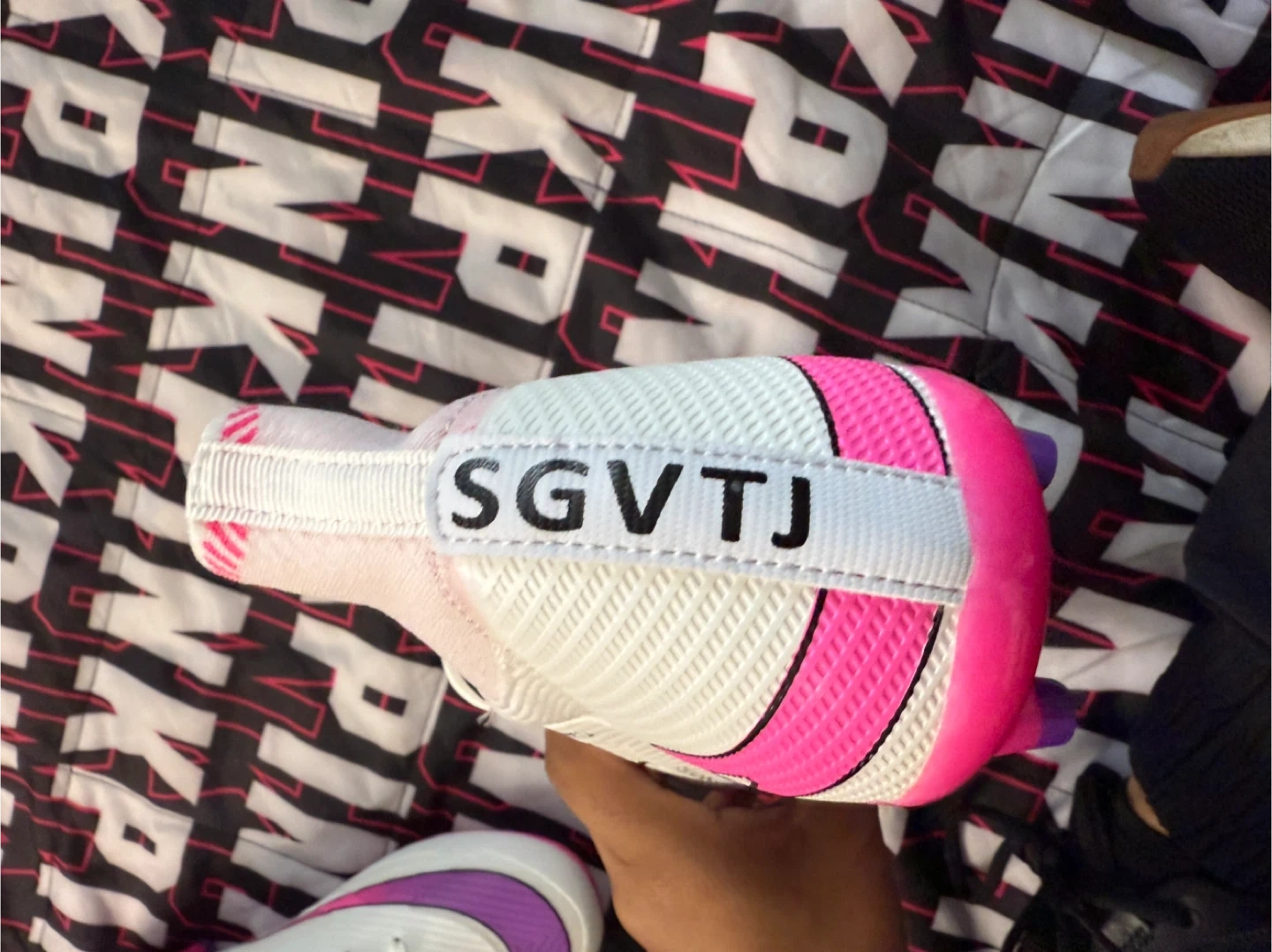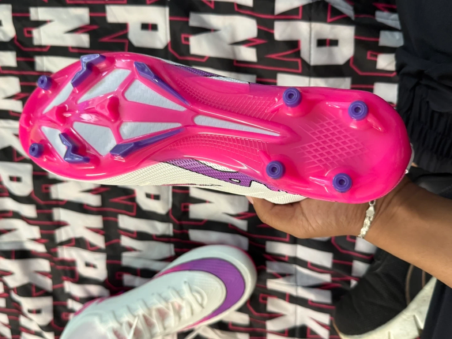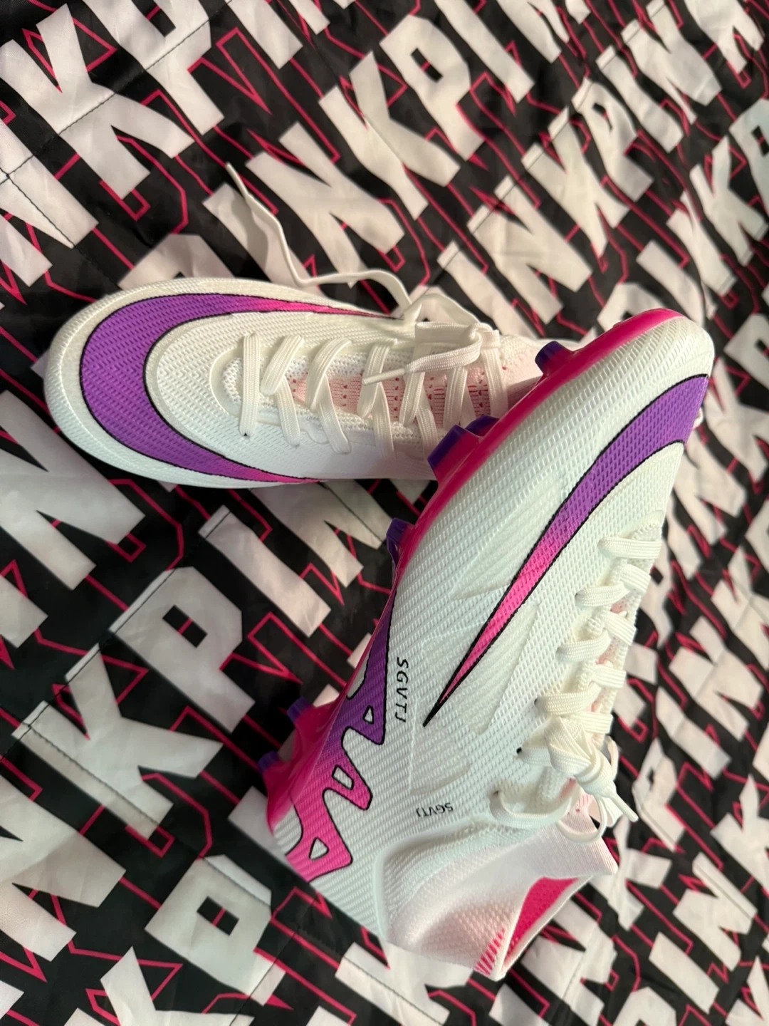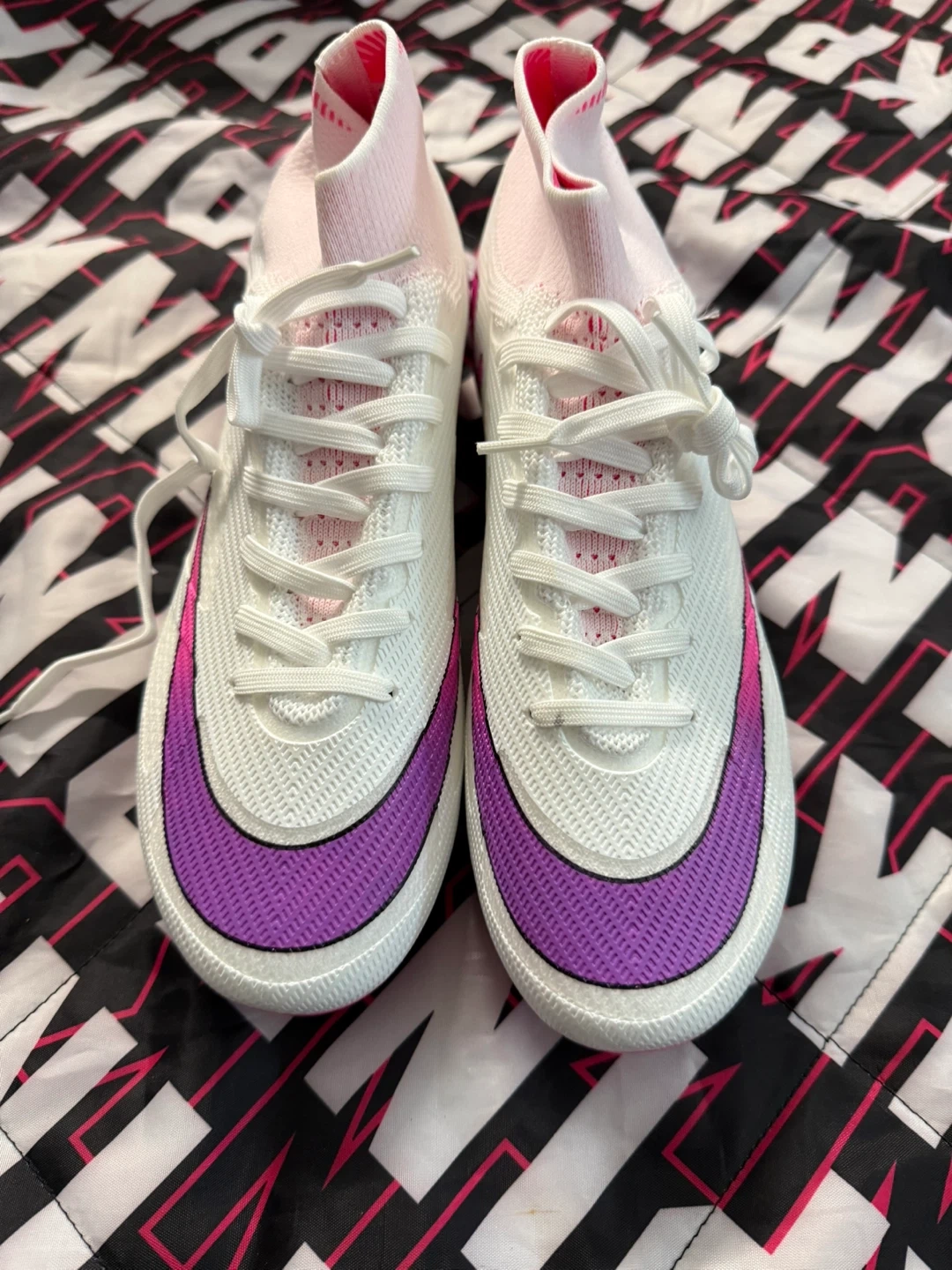 Selling a pair of Nike soccer cleats in white, pink, and purple! They are in great condition and ready for the field. The size is 41.