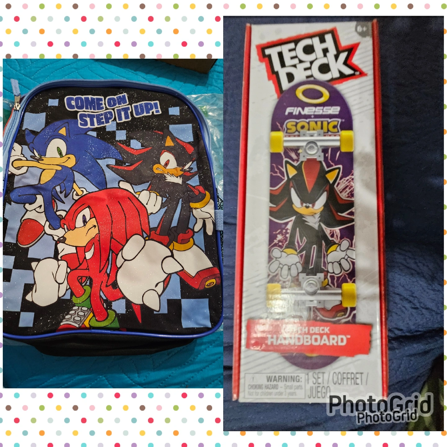 I'm selling a brand new Sonic the Hedgehog backpack and a Tech Deck handboard featuring Sonic characters! The backpack is red, blue, and black with a fun design. The Tech Deck handboard is still in its original packaging, making it a great find for any Sonic fan. PICK UP ONLY