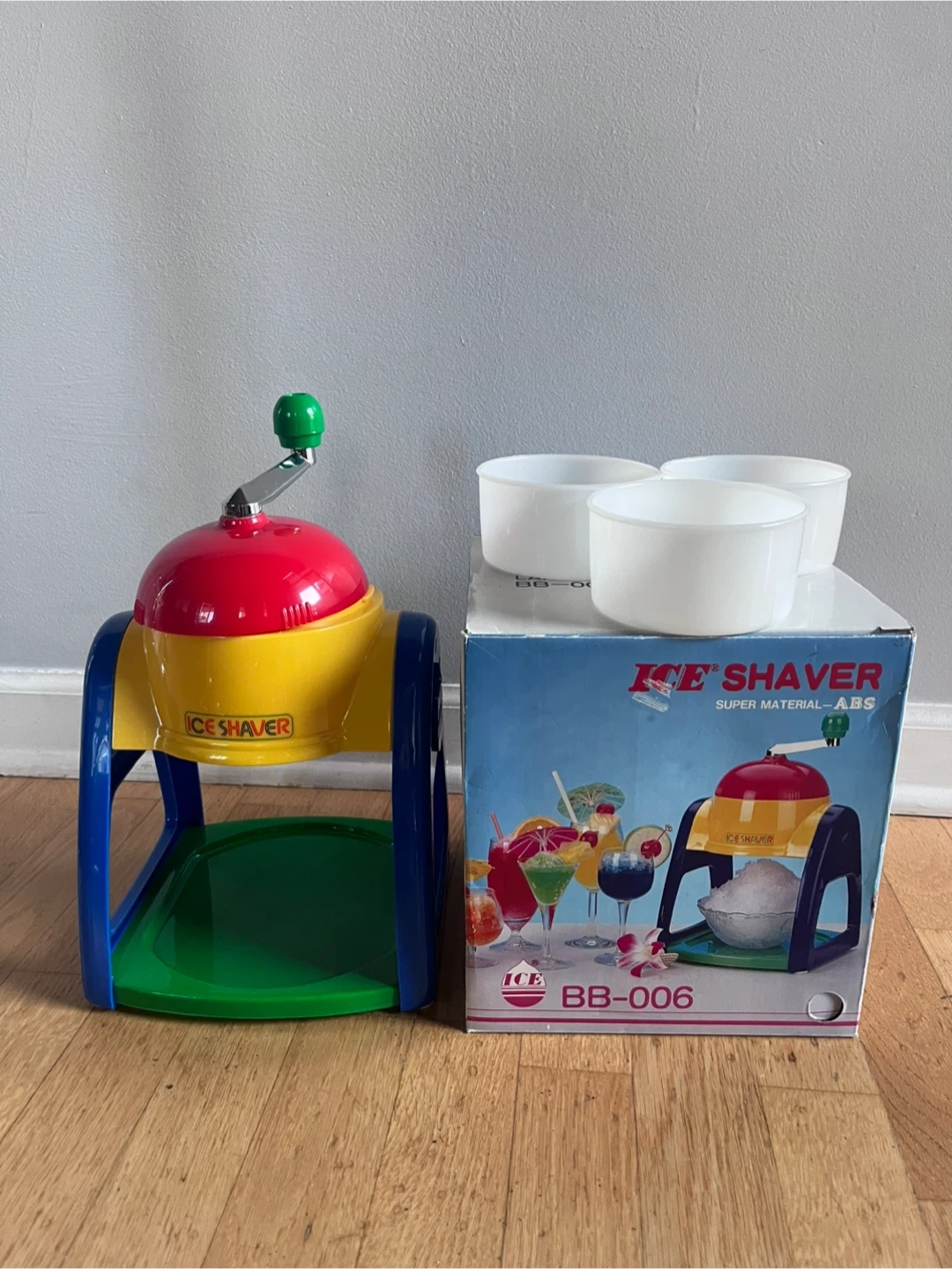Selling a brand new ice shaver. It comes with three bowls and the original box. This manual ice shaver is perfect for making refreshing treats at home.