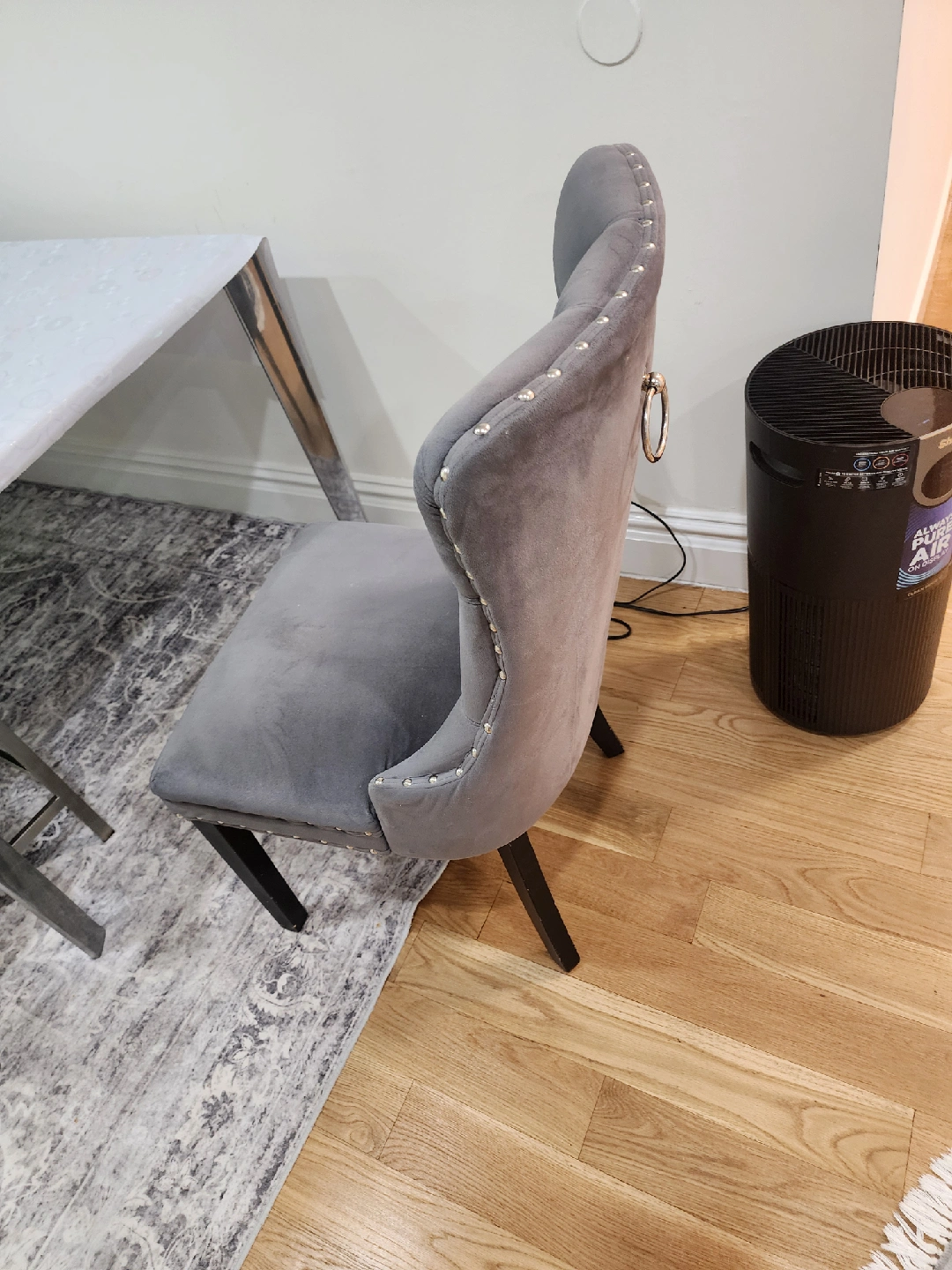 Selling a stylish gray velvet dining chair. It features a tufted back and studded trim, adding a touch of elegance to any dining space. The chair is in great condition and ready to be a part of your home! 2 chairs,