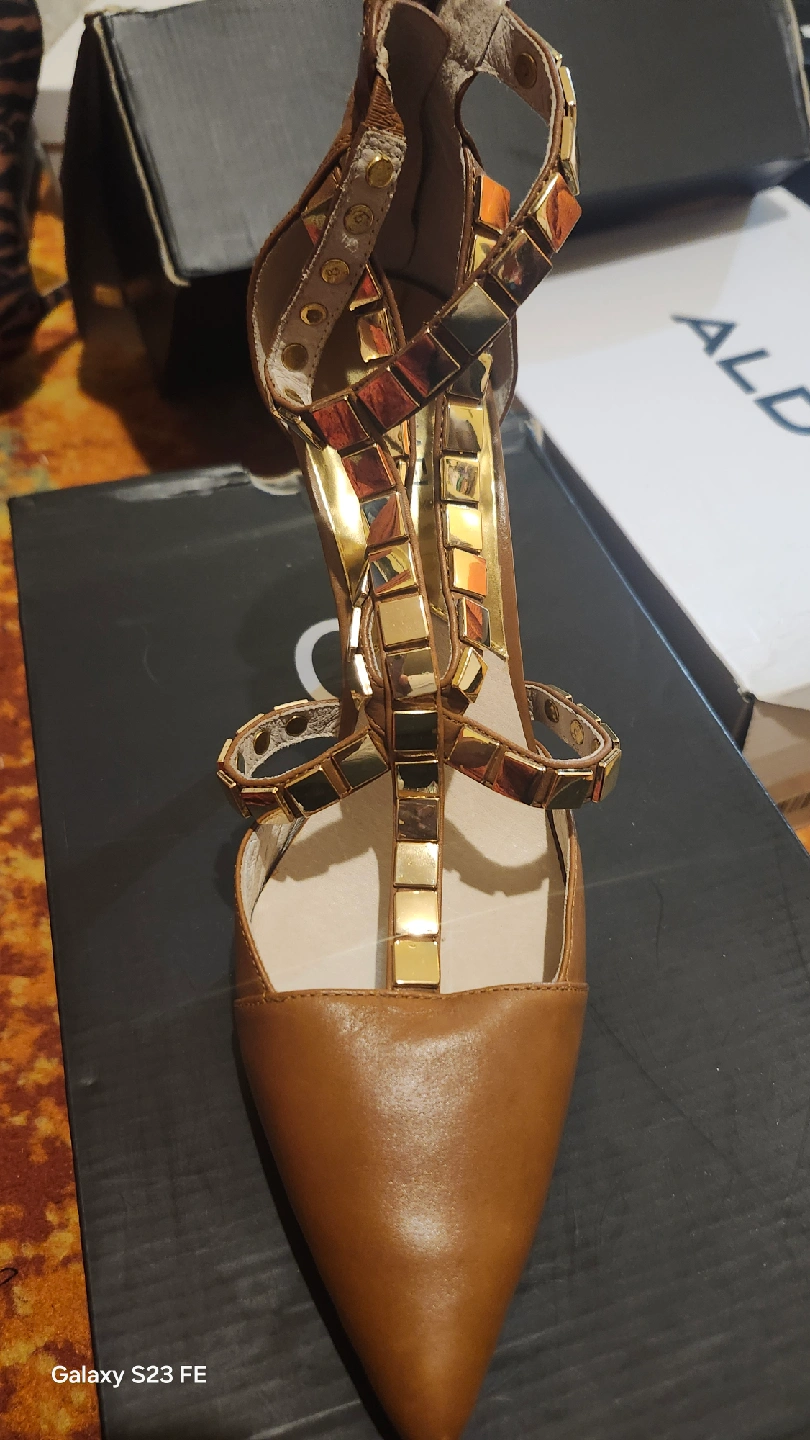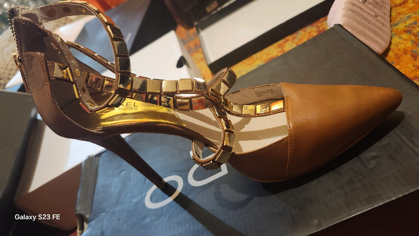 Selling a pair of Michael Kors heels in brown and gold. They are a size 9 and feature a stylish design with gold accents. Perfect for a night out or special occasion!