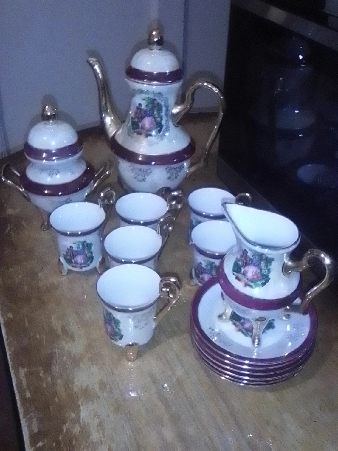 A beautiful mixed dinnerware set and vintage tea set with a teapot, sugar bowl, creamer, cups, and saucers. It features a delicate floral design and gold accents. The dinnerware set includes three forest green large plates, three medium cake plates, four medium sized bowls and three cream colored medium sized bowls. Perfect for collectors or anyone who enjoys a touch of elegance. In this little set it includes: 6 cups 6 plates 1 teapot 1 sugar bowl 1 creamer pot The second set includes: 3 large plates 3 medium cake plates 4 medium sized bowls 3 cream colored medium sized bowls