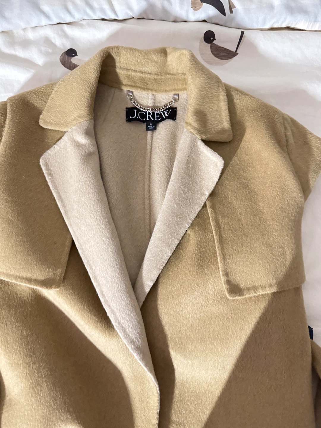 Selling a stylish J.Crew belted coat in a lovely tan color! It's in great condition and ready to keep you warm and fashionable. Perfect for layering during the cooler months