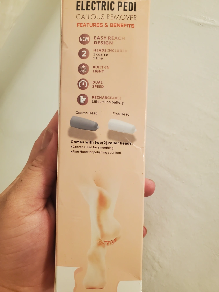 91I'm selling a new electric pedi callous remover! It has a salon quality pedicure device for beautiful, youthful feet. It features an easy reach design with two heads included: one coarse and one fine. It also has a built-in light and dual speed! It's rechargeable with a lithium ion battery and comes with two roller heads: a coarse head for smoothing and a fine head for polishing your feet