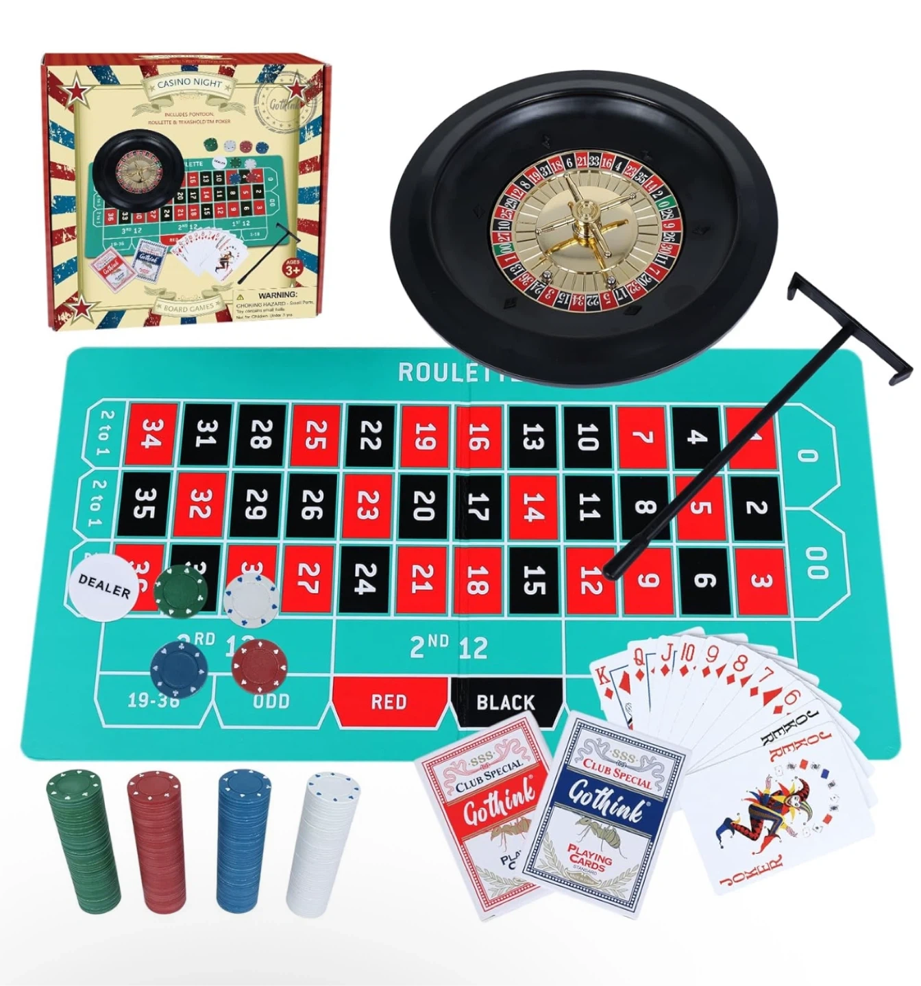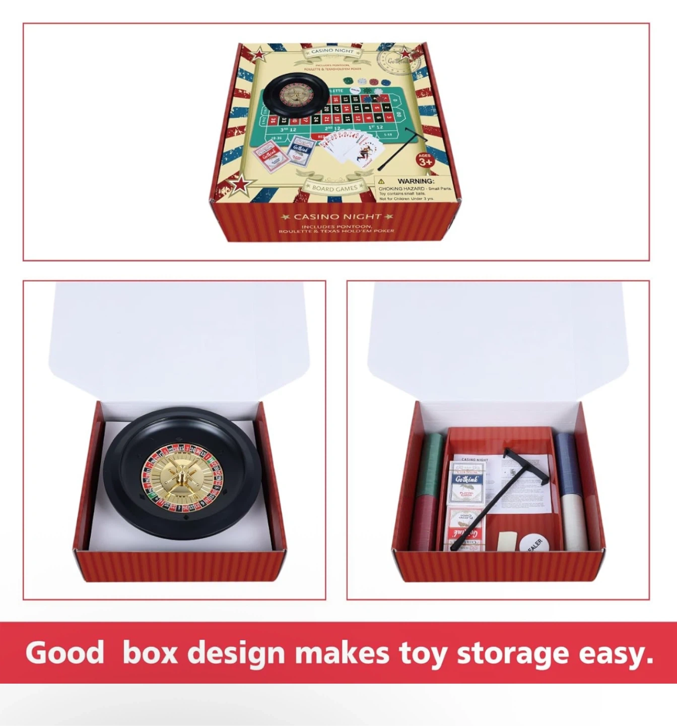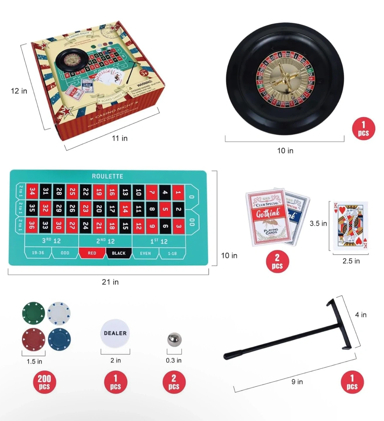 Get ready for a fun game night with this Casino Night Roulette & Texas Hold'em Poker set! The set includes everything you need for a night of casino fun, including a roulette wheel, playing cards, chips, and a betting mat. This set is perfect for family game nights or parties with friends