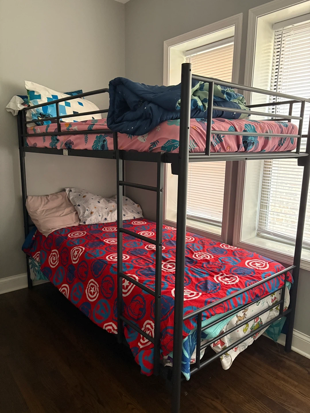 Selling a metal frame bunk bed. It's in good condition and ready for a new home. Perfect for kids' rooms or guest rooms! It is completely new, they only occupied it for 2 months but due to moving I need to sell it.