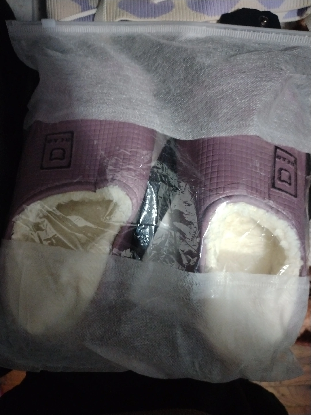 I'm selling a pair of brand new purple slippers with a cute bear logo! They are size 36-37.
