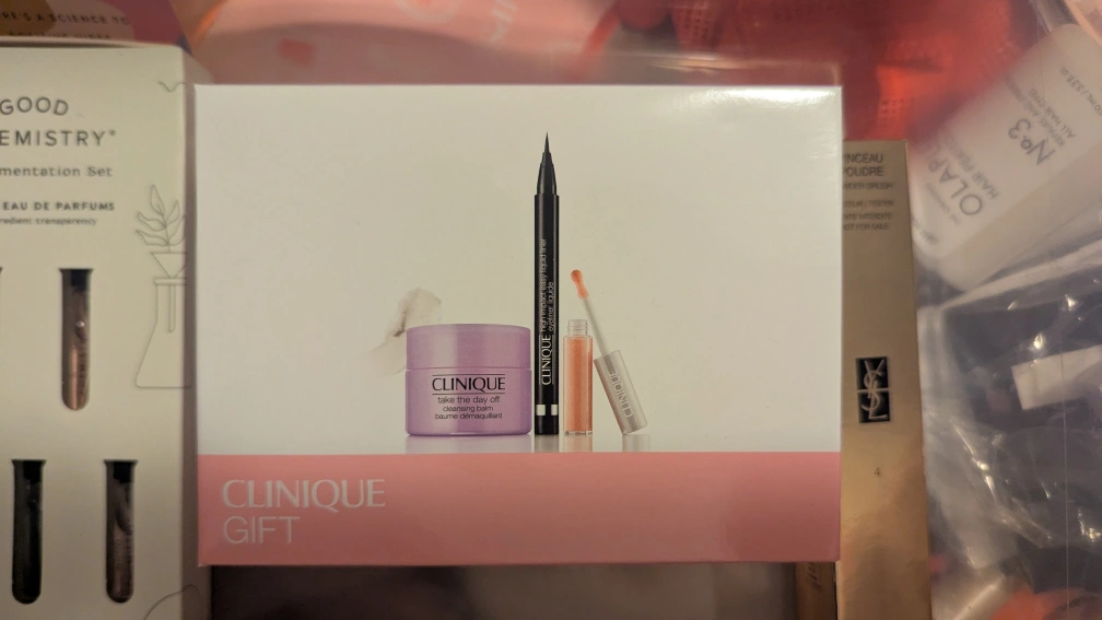 Selling a Clinique gift set featuring the Take the Day Off cleansing balm! This set also includes eyeliner and lip gloss, perfect for a complete makeup routine. It's a great way to try out some of Clinique's popular products. Perfect for a gift.