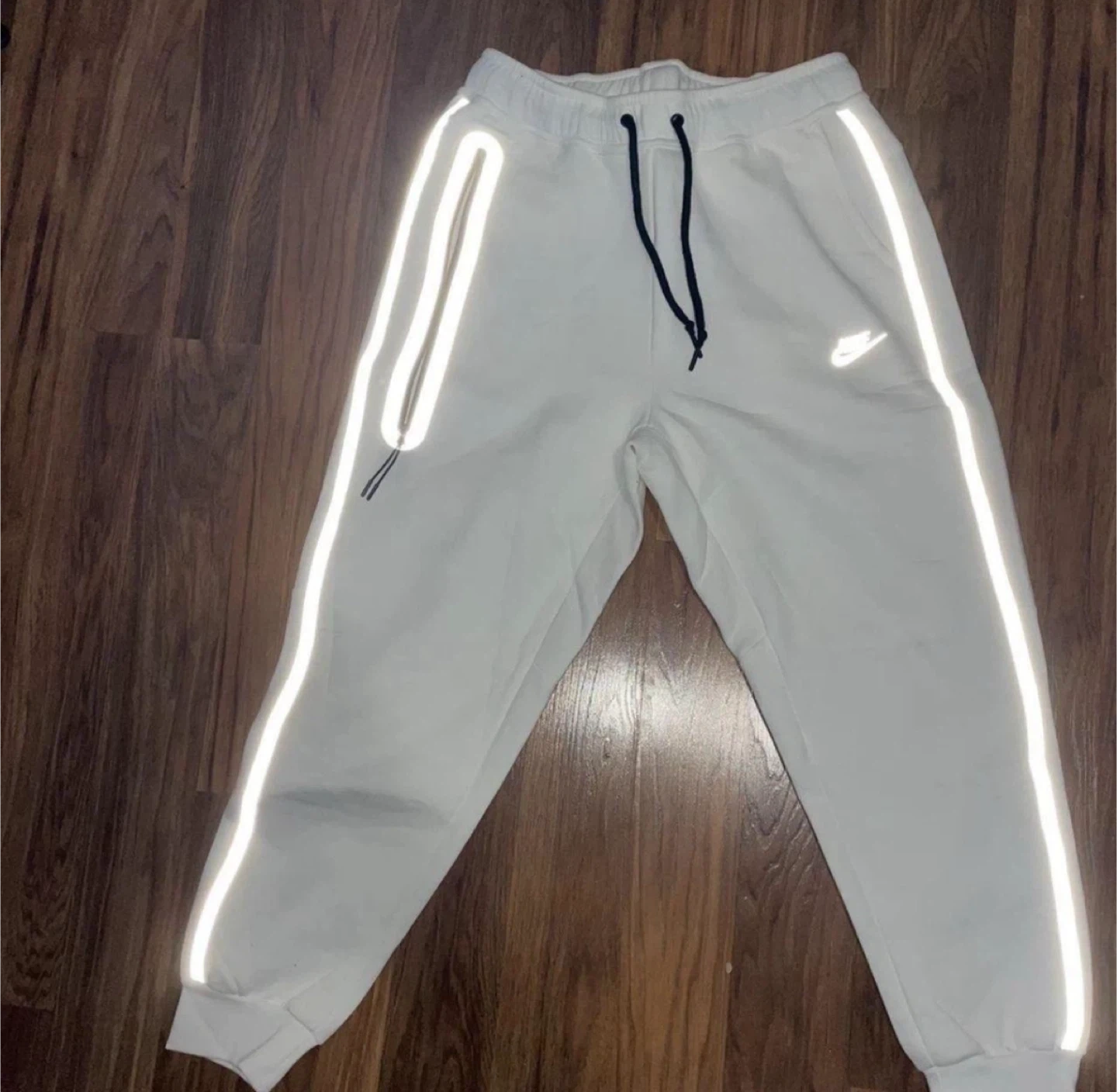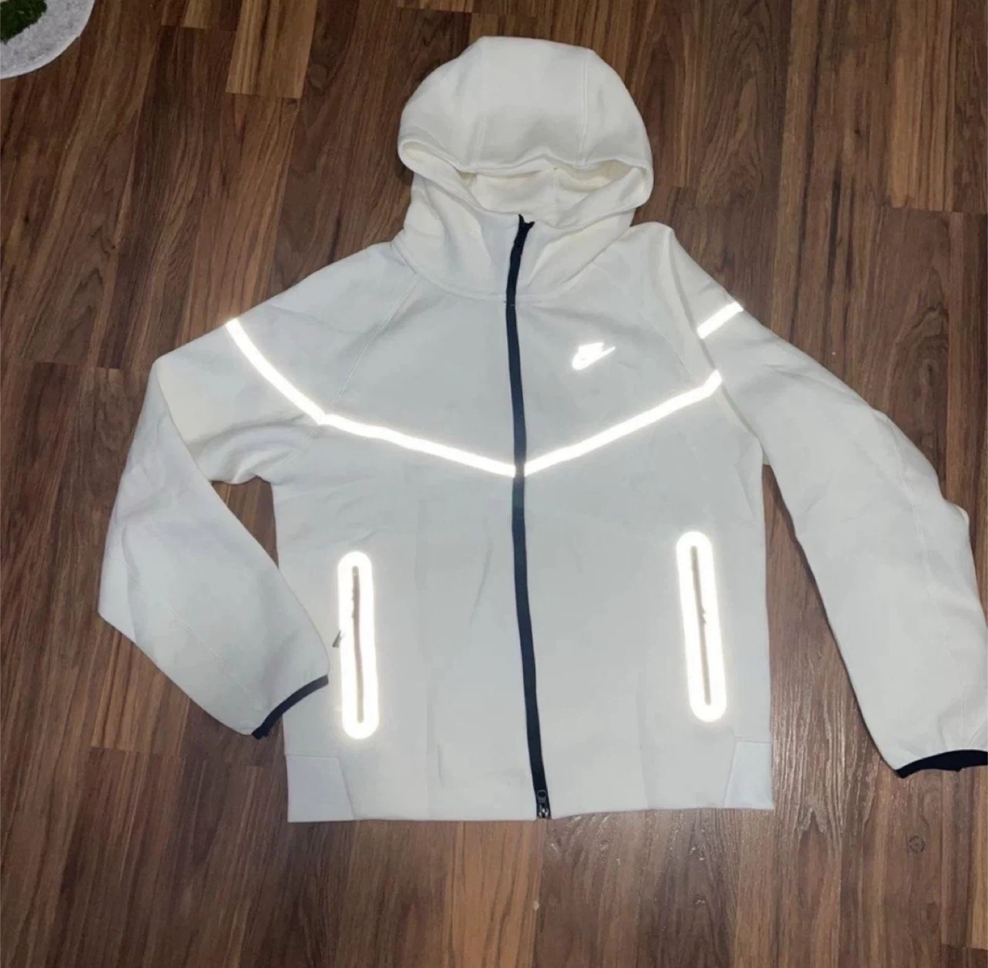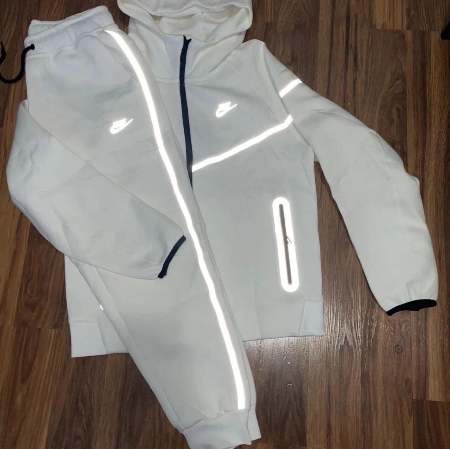 Selling a Nike Tech Fleece set in white with reflective details! The set includes both the hoodie and the pants. Great for staying visible during evening activities or just rocking a stylish, sporty look