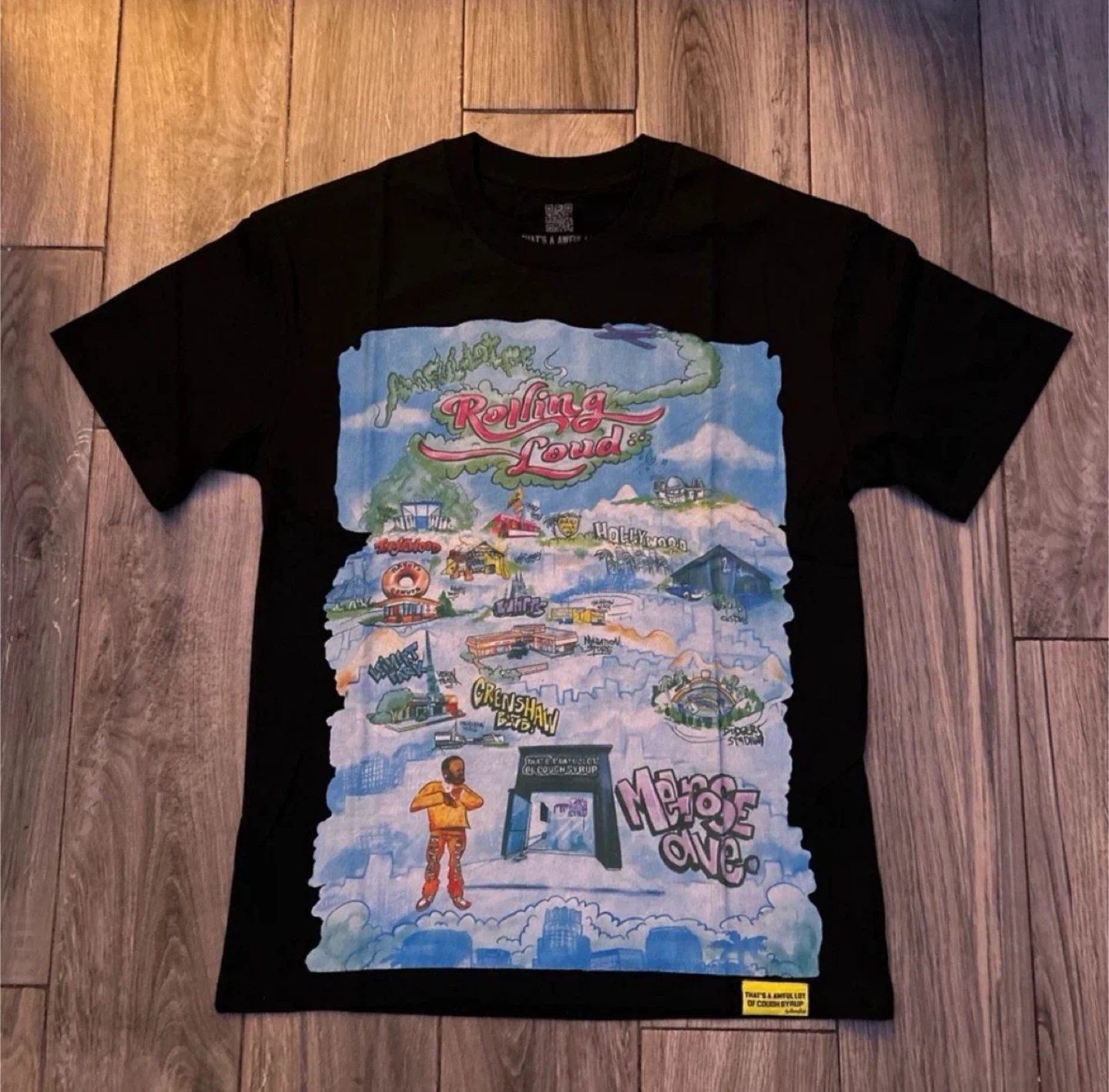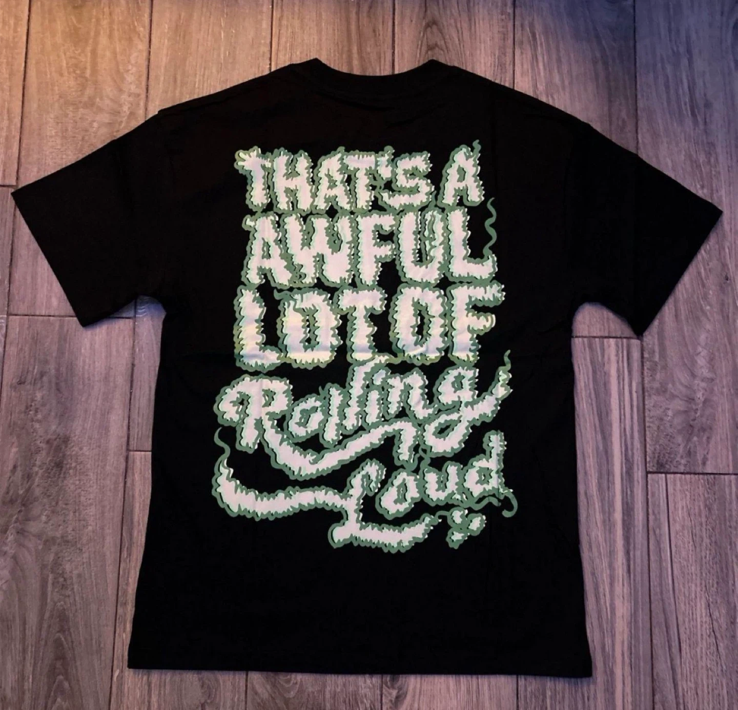Here's a black Rolling Loud t-shirt with a colorful graphic on the front and back. It features a map-like design with various locations and the Rolling Loud logo. The back has the words "That's a Awful Lot of Rolling Loud". BRAND NEW (If you need another size lmk. that can be arranged) IF INTERESTED PLEASE DM ME BEFORE BUYING I CAN ONLY SHIP IN THE MOMENT ✨HMU FOR ANY OTHER MODEL/COLOR ✨ (Have a lot of clothing in stock. Check out my website if interested)