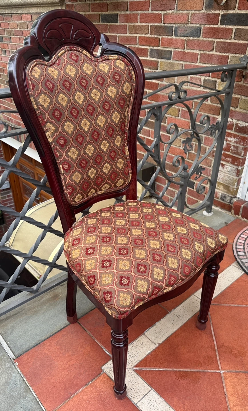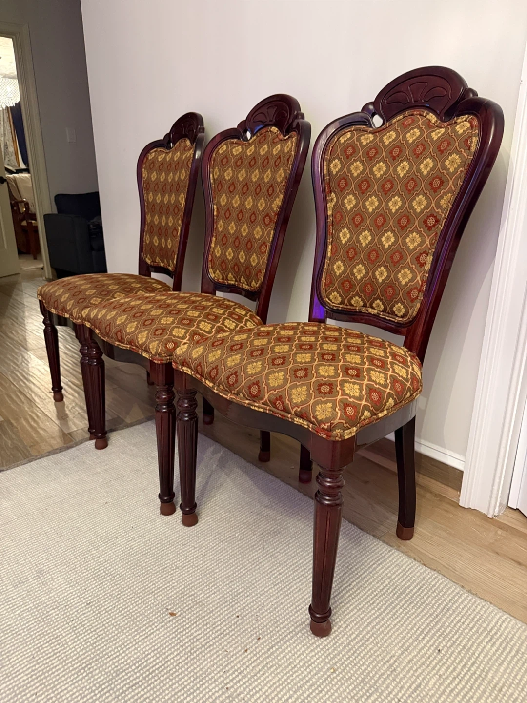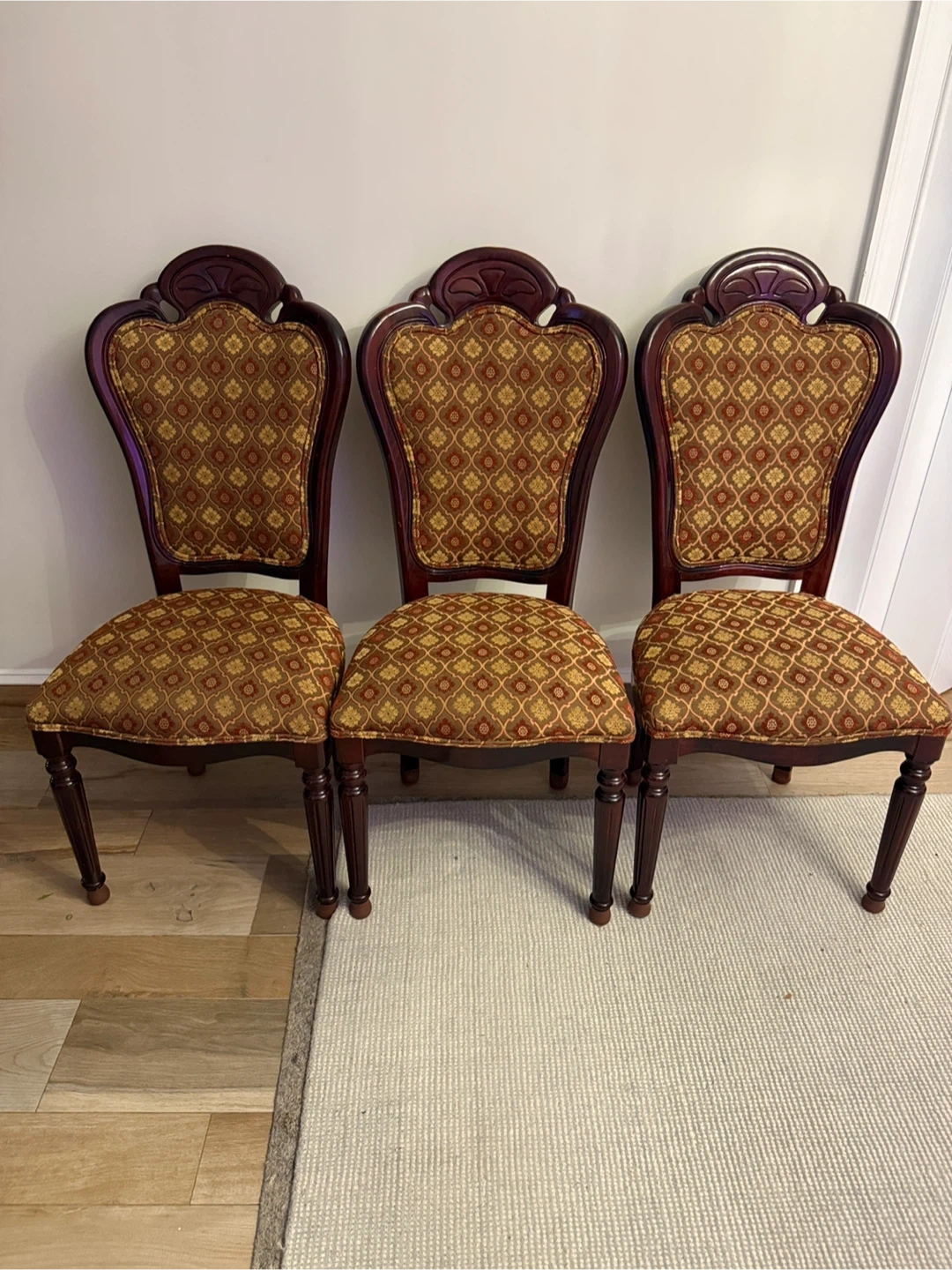 Selling a set of 3 dining chairs. They have a beautiful brown and gold patterned fabric on the seat and back. The wood is a deep, rich color. These chairs would add a touch of elegance to any dining room