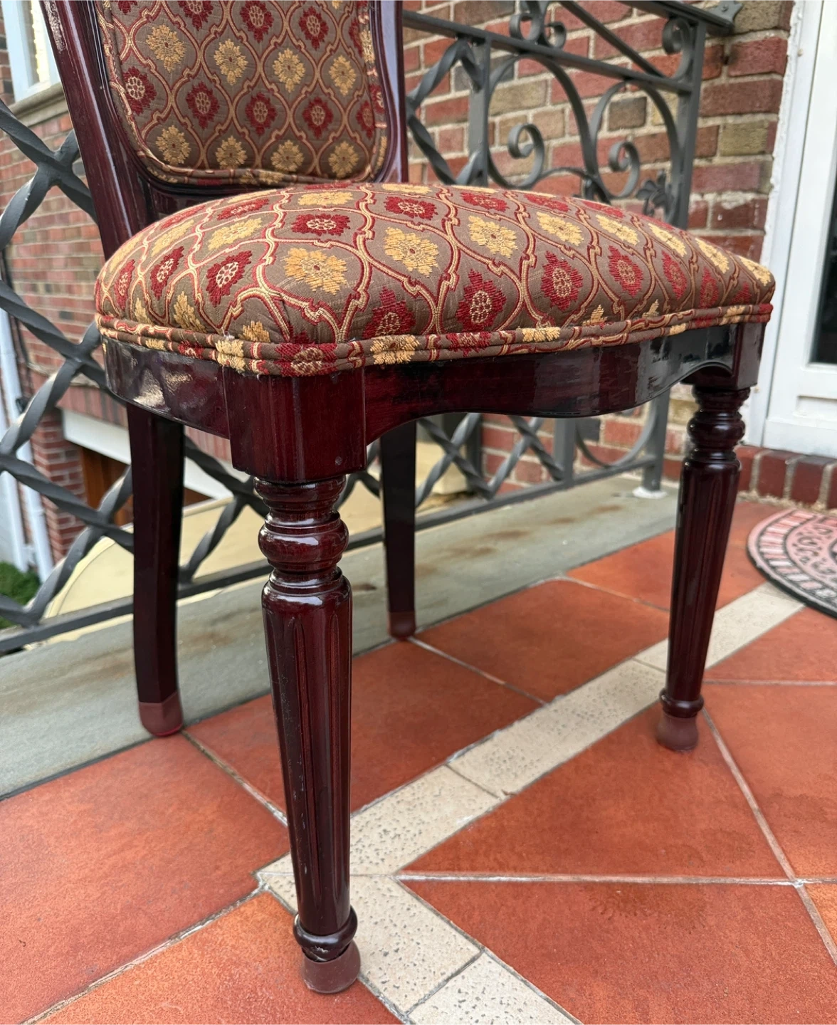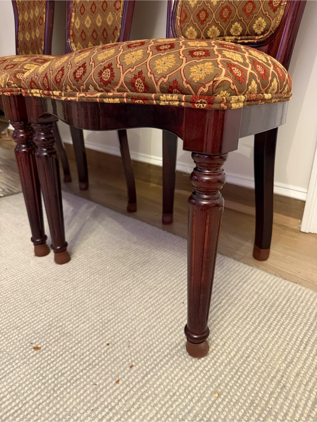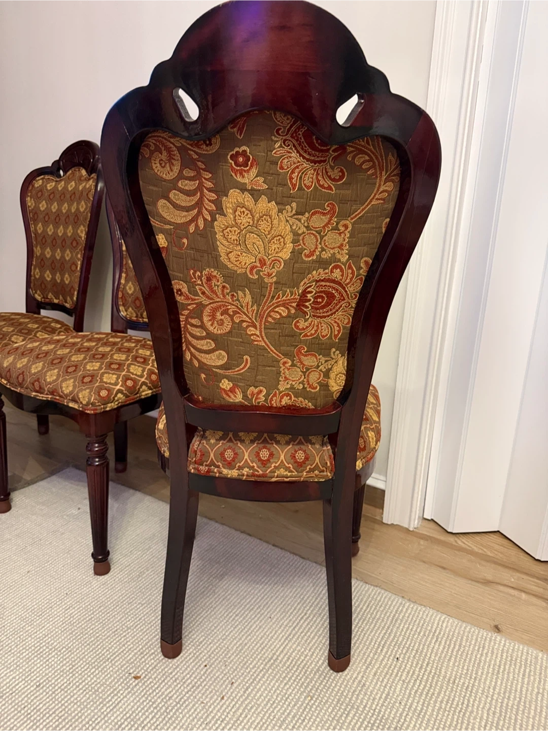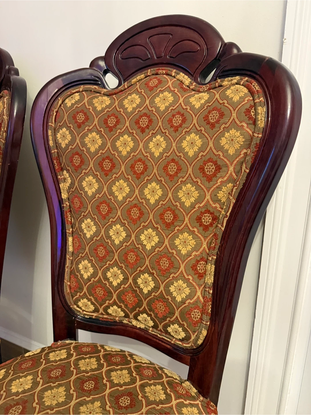 Selling a set of 3 dining chairs. They have a beautiful brown and gold patterned fabric on the seat and back. The wood is a deep, rich color. These chairs would add a touch of elegance to any dining room