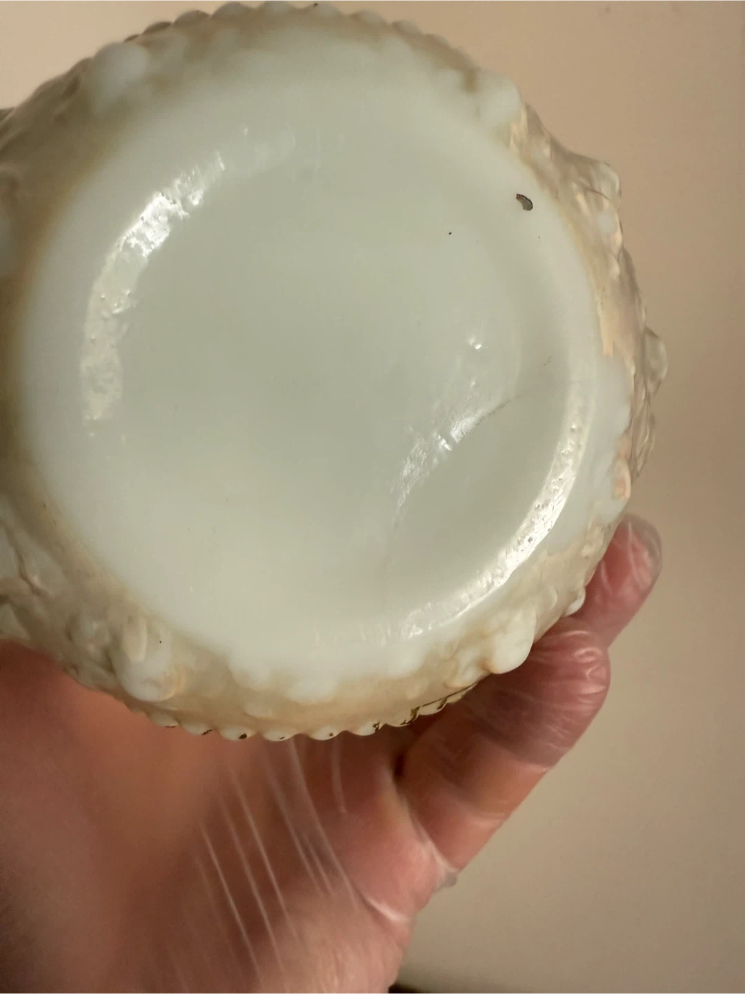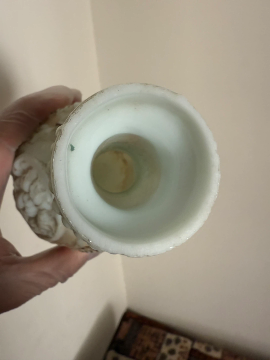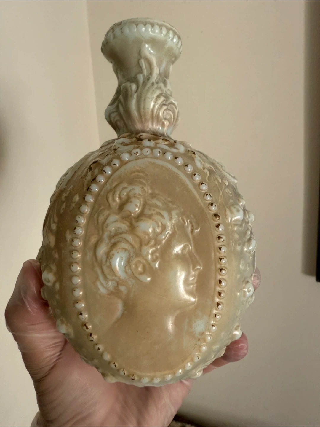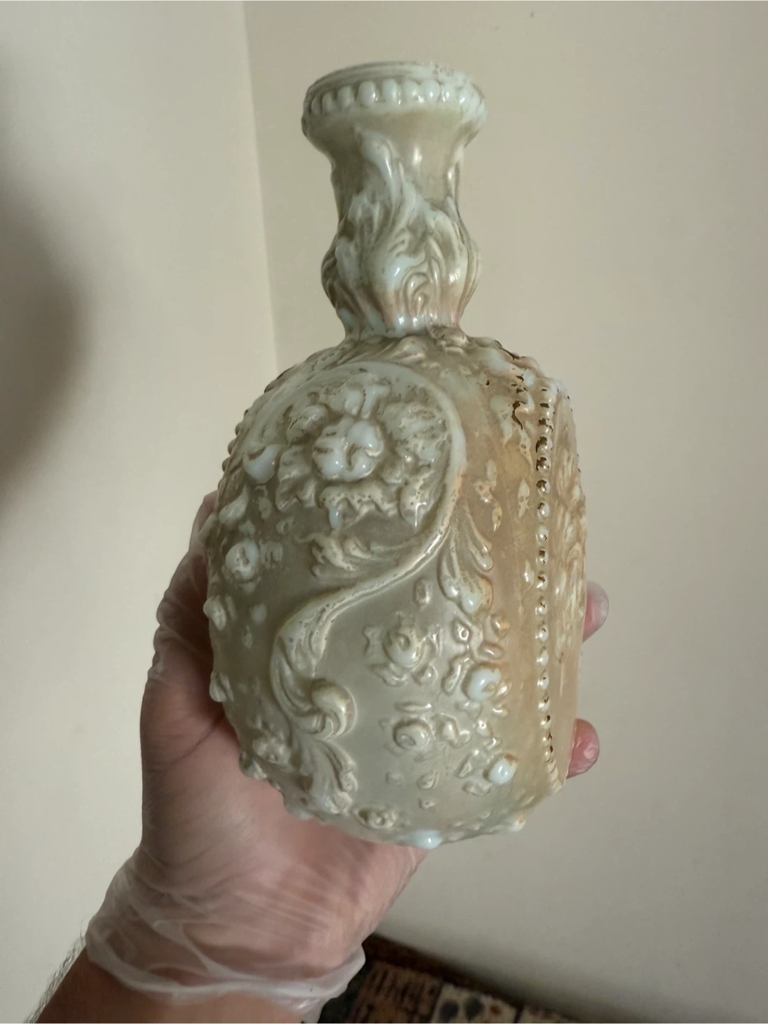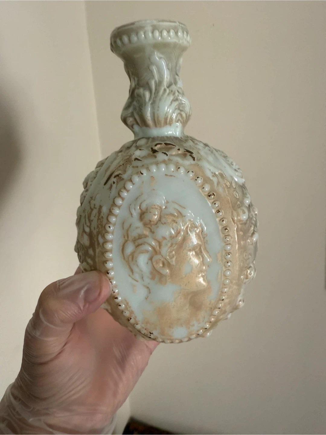 Selling a beautiful vintage Fenton milk glass vase. It features an ornate design with raised floral and cameo details. The vase is in good condition and would make a lovely addition to any home decor