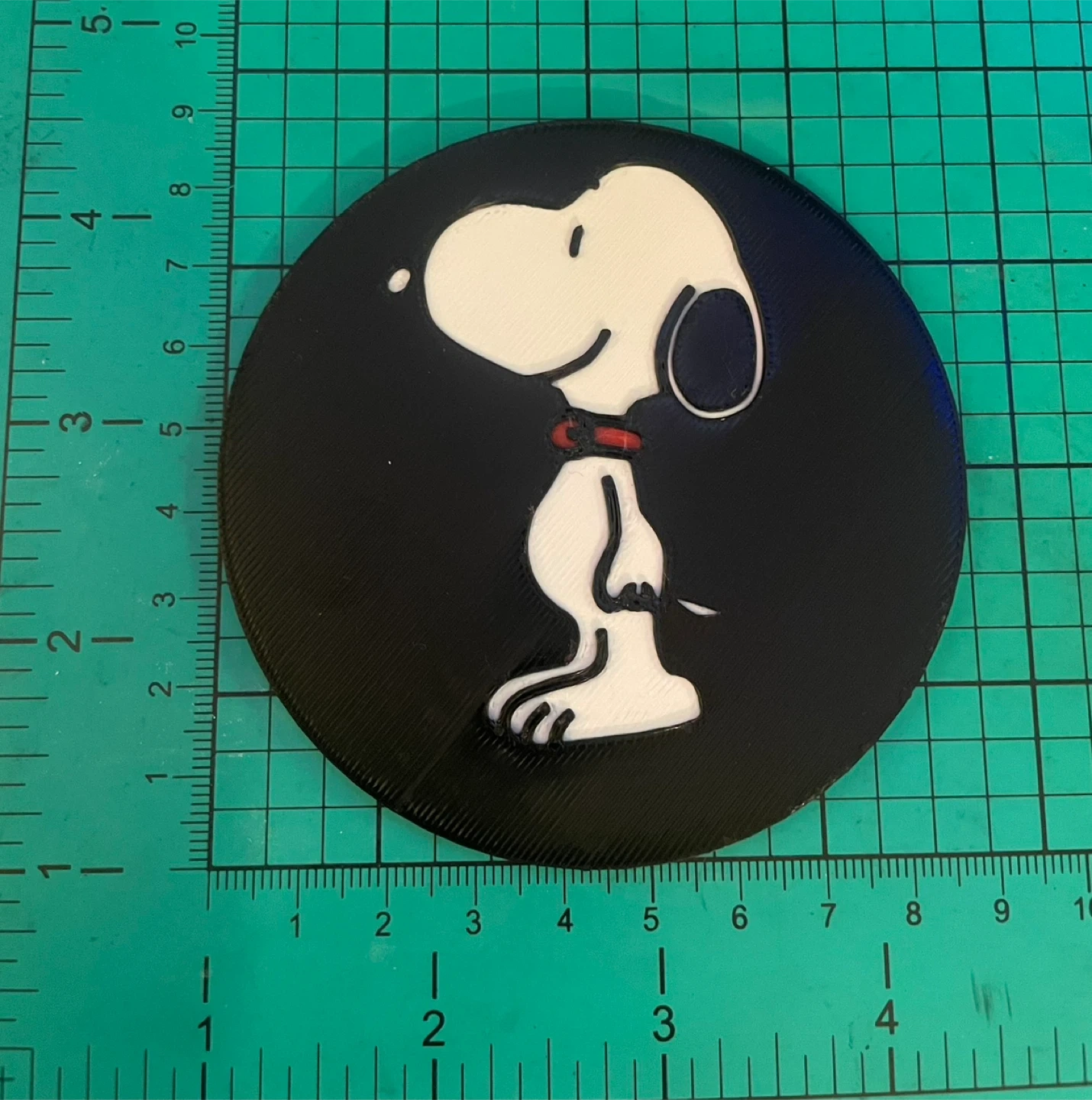 This is a 3D printed coaster featuring Snoopy. It's black and round, perfect for protecting your surfaces. Add a touch of fun to your home decor with this cute coaster