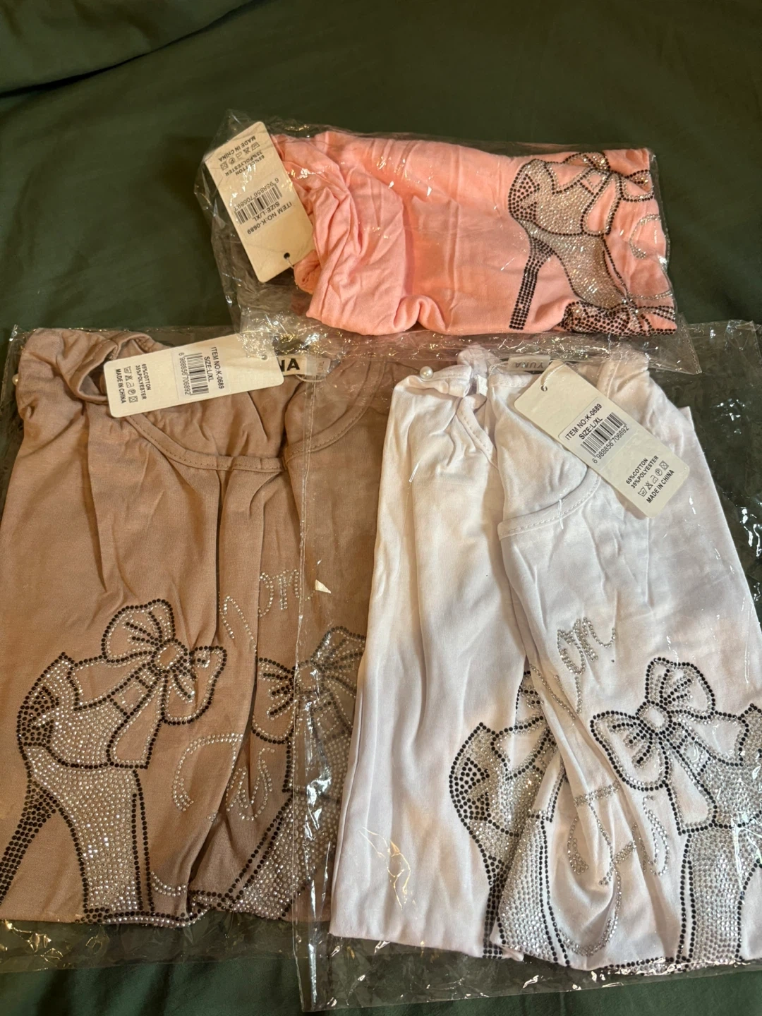 I have a new women's T-shirt with a rhinestone design. It features a cute bow and high heel design made of rhinestones. Perfect for adding a little sparkle to your outfit!