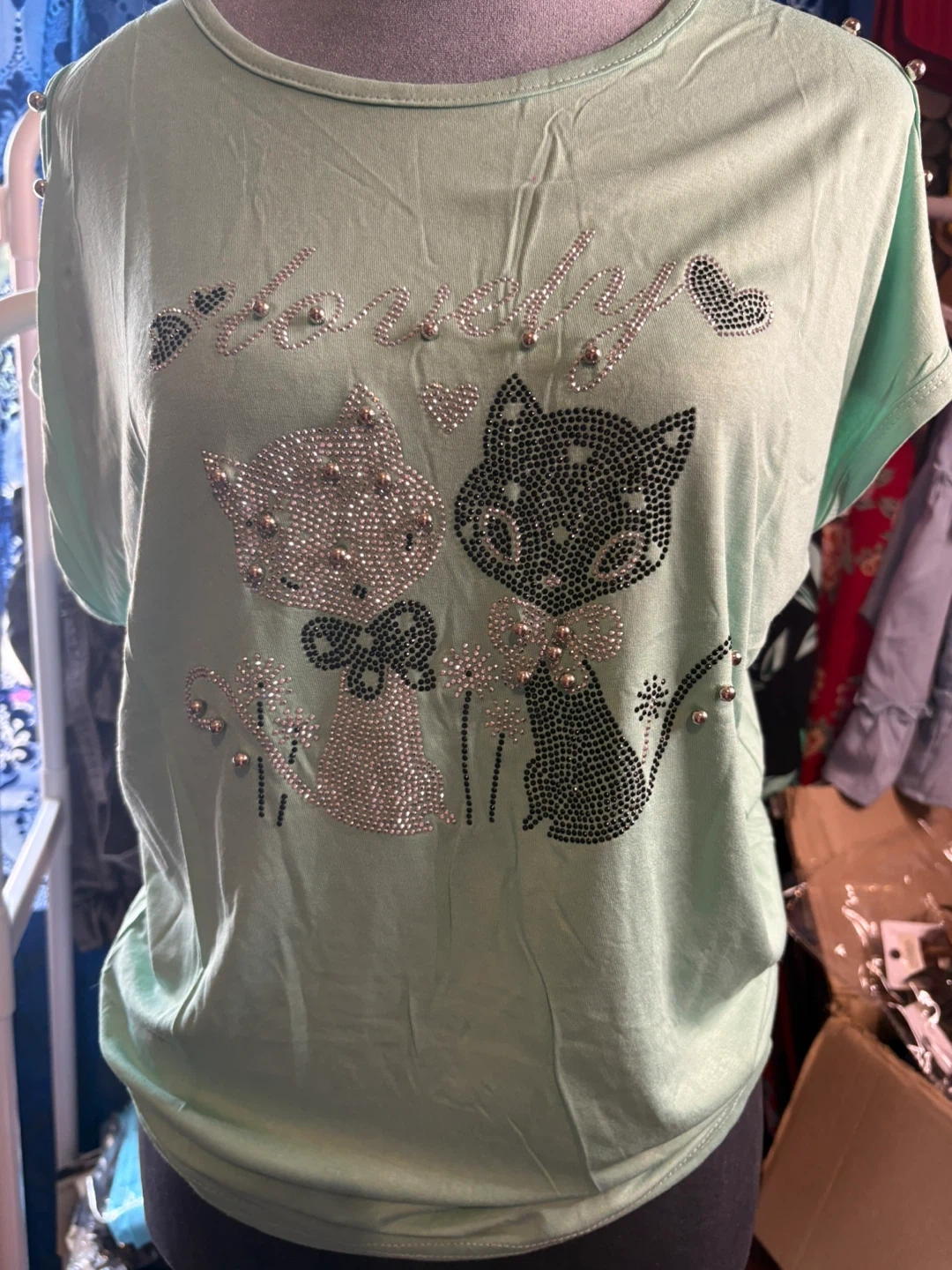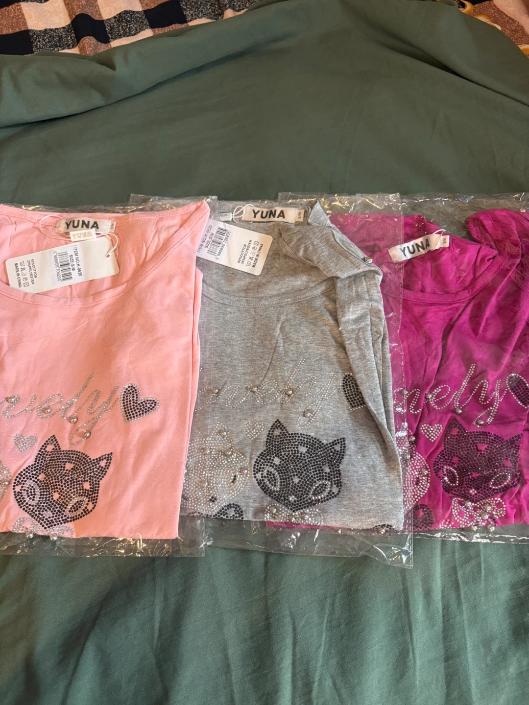 Cute Yuna t-shirts with a lovely cat rhinestone design! Available in pink, gray, and fuchsia. Size XL. They're brand new and ready for a new home