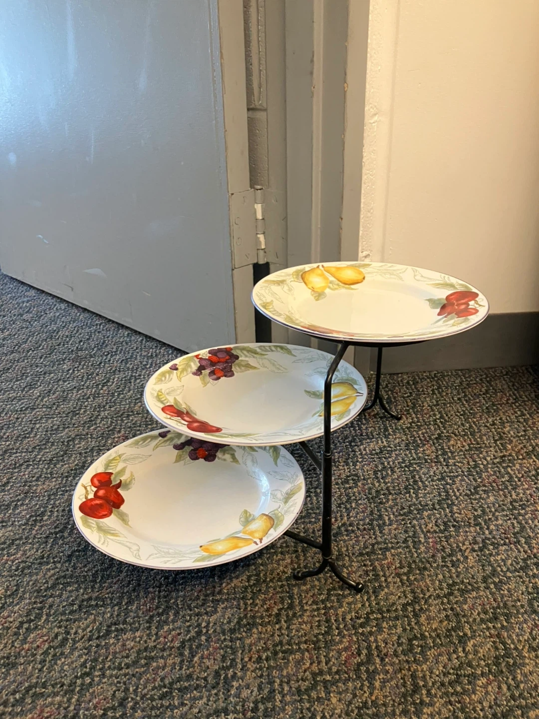 Buy & Sell3-Tiered Serving Stand with Fruit Design3-Tiered Serving Stand with Fruit Design$5This is a cute 3-tiered serving stand! It features a fruit design on each plate and a black metal stand. Perfect for displaying desserts or appetizersConditionLike new2 chats·2 favorites·57 viewsSELLERPam PoteteBelmont Cragin26224 reviewsWHERE TO MEETCheck Location
