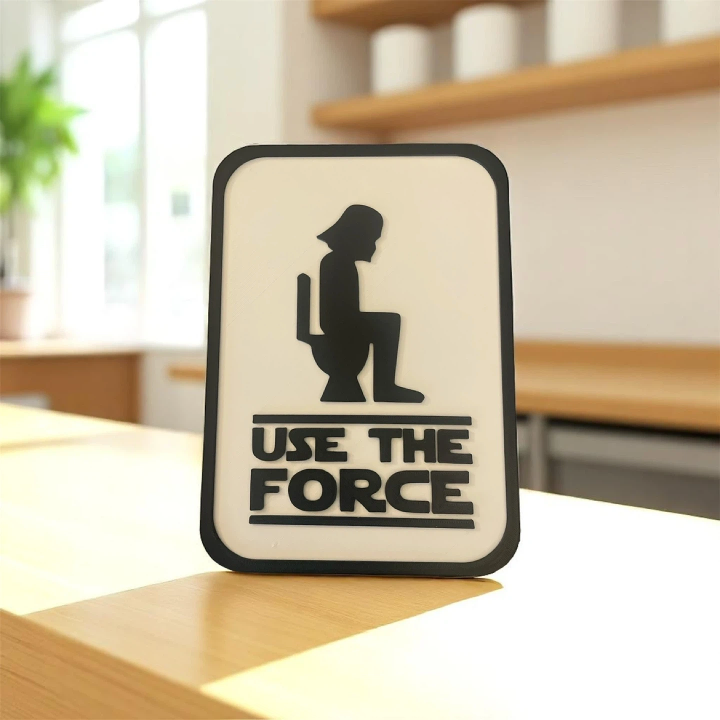 This is a fun Star Wars themed bathroom sign. It says 'Use the Force' with a silhouette of Darth Vader sitting on a toilet. It's a great way to add some humor to your bathroom decor!
