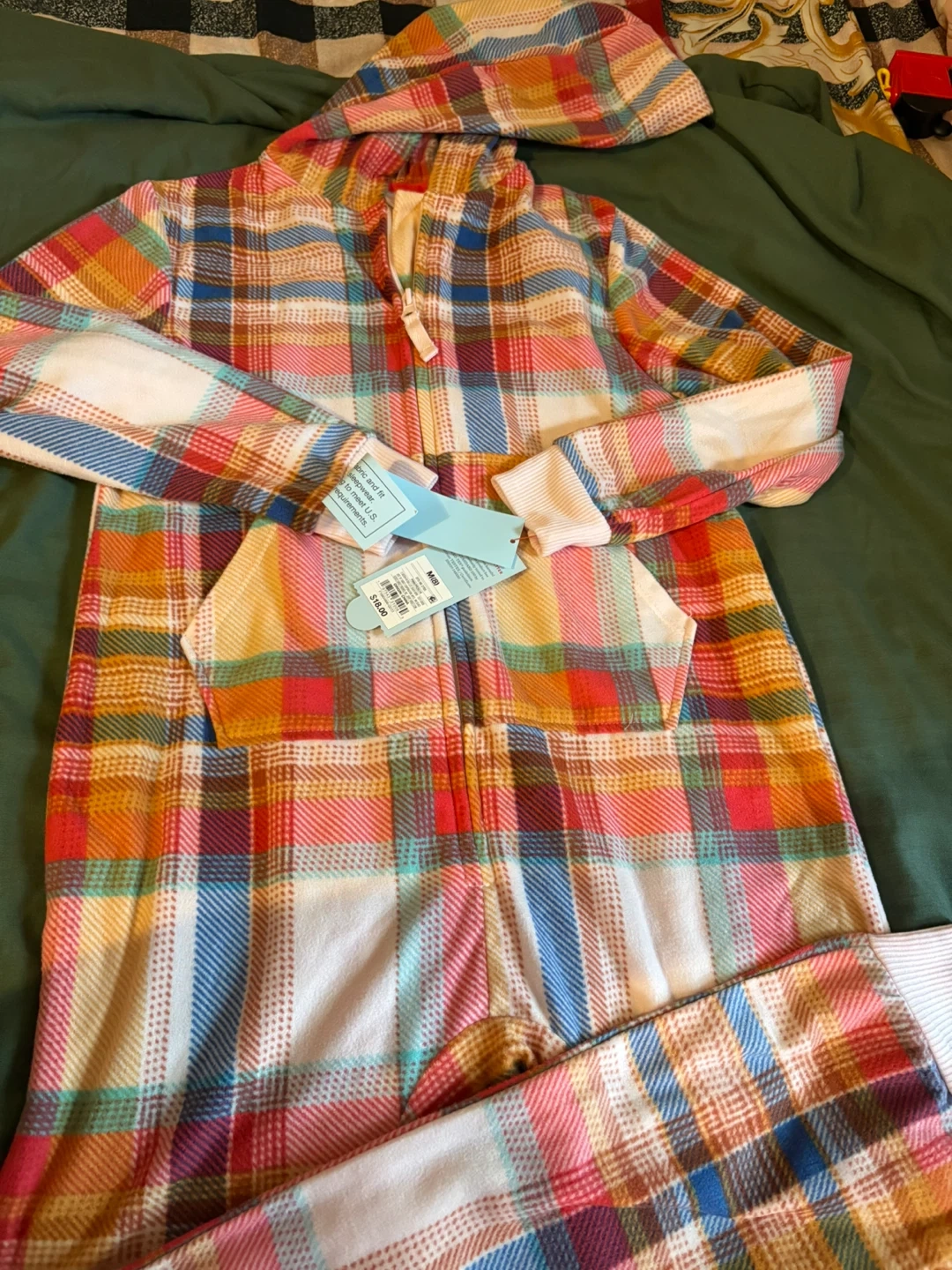 Here's a super cute and cozy Cat & Jack hooded onesie in a fun plaid pattern! It's a size M(8) and looks to be in great condition. Originally bought for $18!