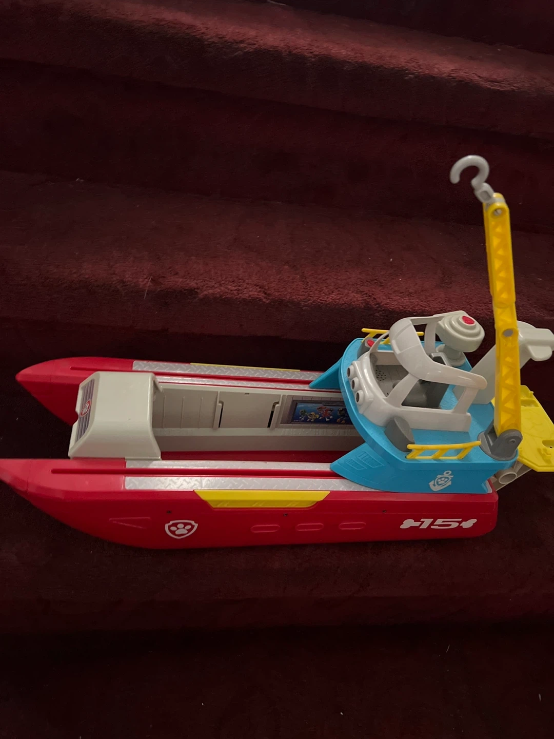 Paw Patrol Sea Patroller boat ready for new adventures! Features a red, white, and blue color scheme with Paw Patrol logos. Perfect for imaginative play!