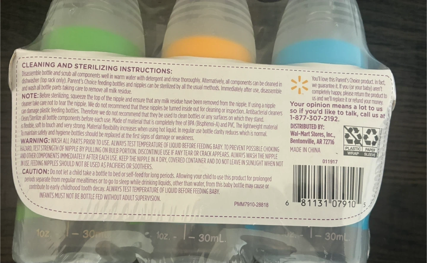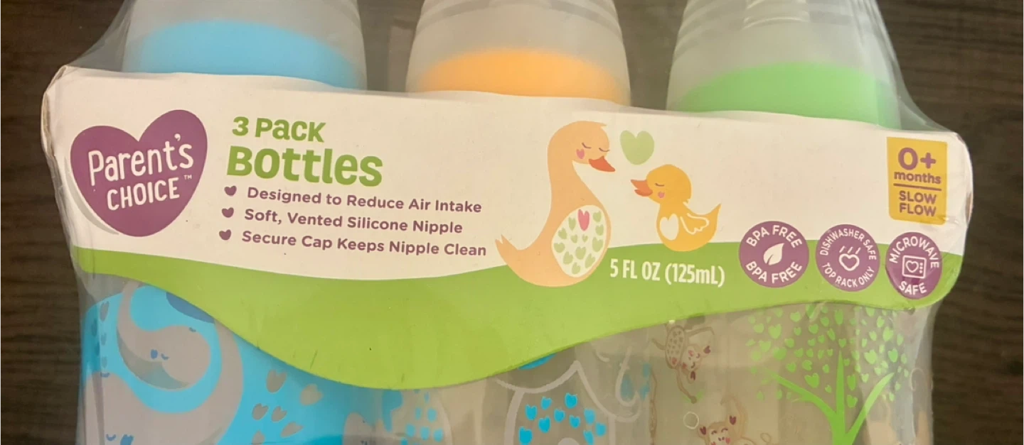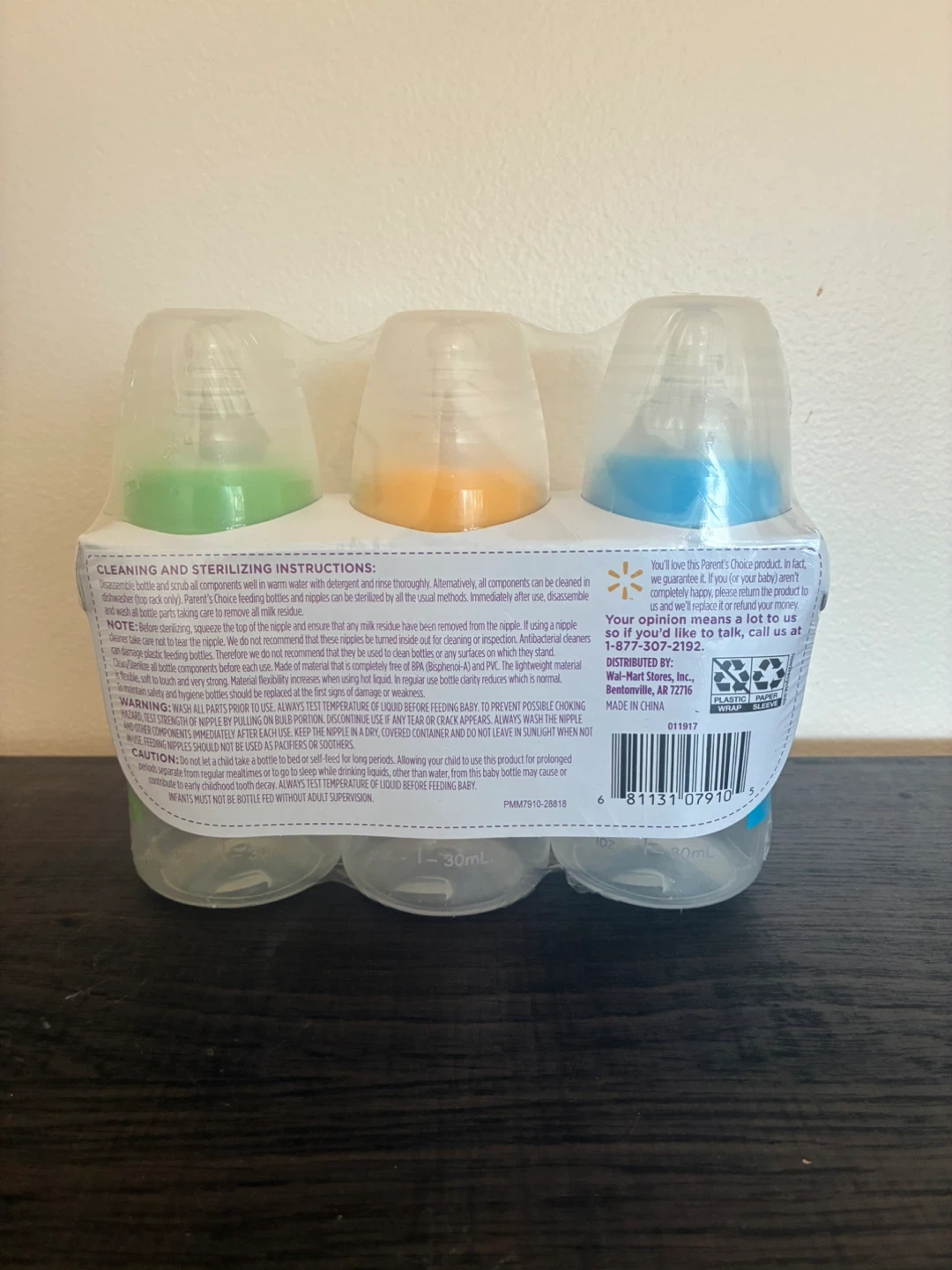 75I'm selling a brand new pack of Parent's Choice bottles! This is a 3 pack of 5 fl oz (125ml) bottles. They are designed to reduce air intake and feature a soft, vented silicone nipple, plus a secure cap that keeps the nipple clean. These bottles are BPA free, dishwasher safe (top rack only), and microwave safe! Perfect for your little one.