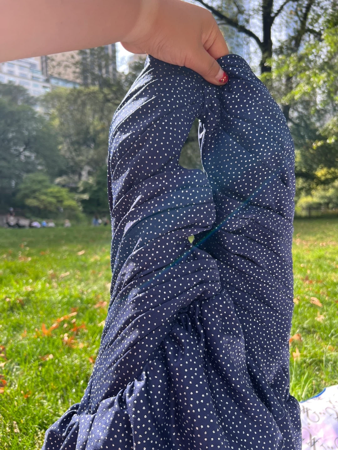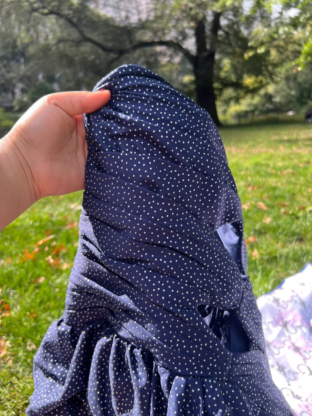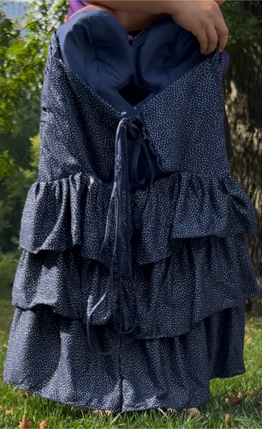 5This is a cute navy blue dress with a white polka dot pattern. It has a ruffle design and is in great condition! Adjustable lacing back and build in bra. Bling bling under the sun. Three layers design.