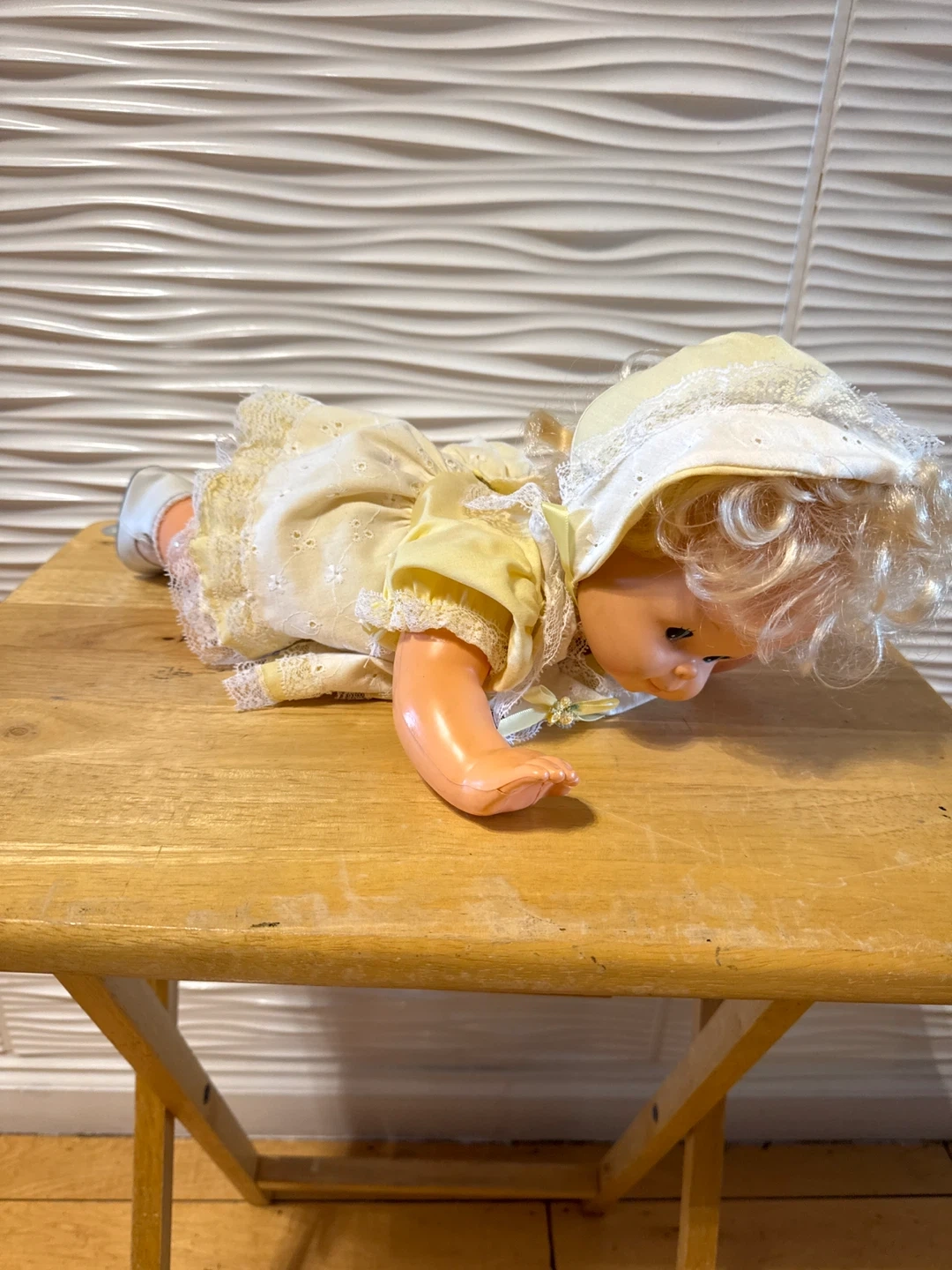 Vintage baby doll with blonde hair and blue eyes wearing a yellow dress and bonnet battery required.