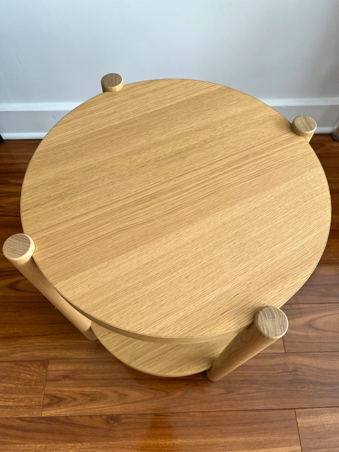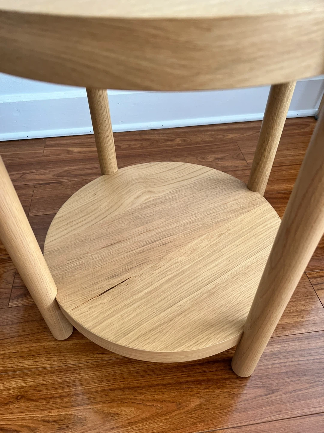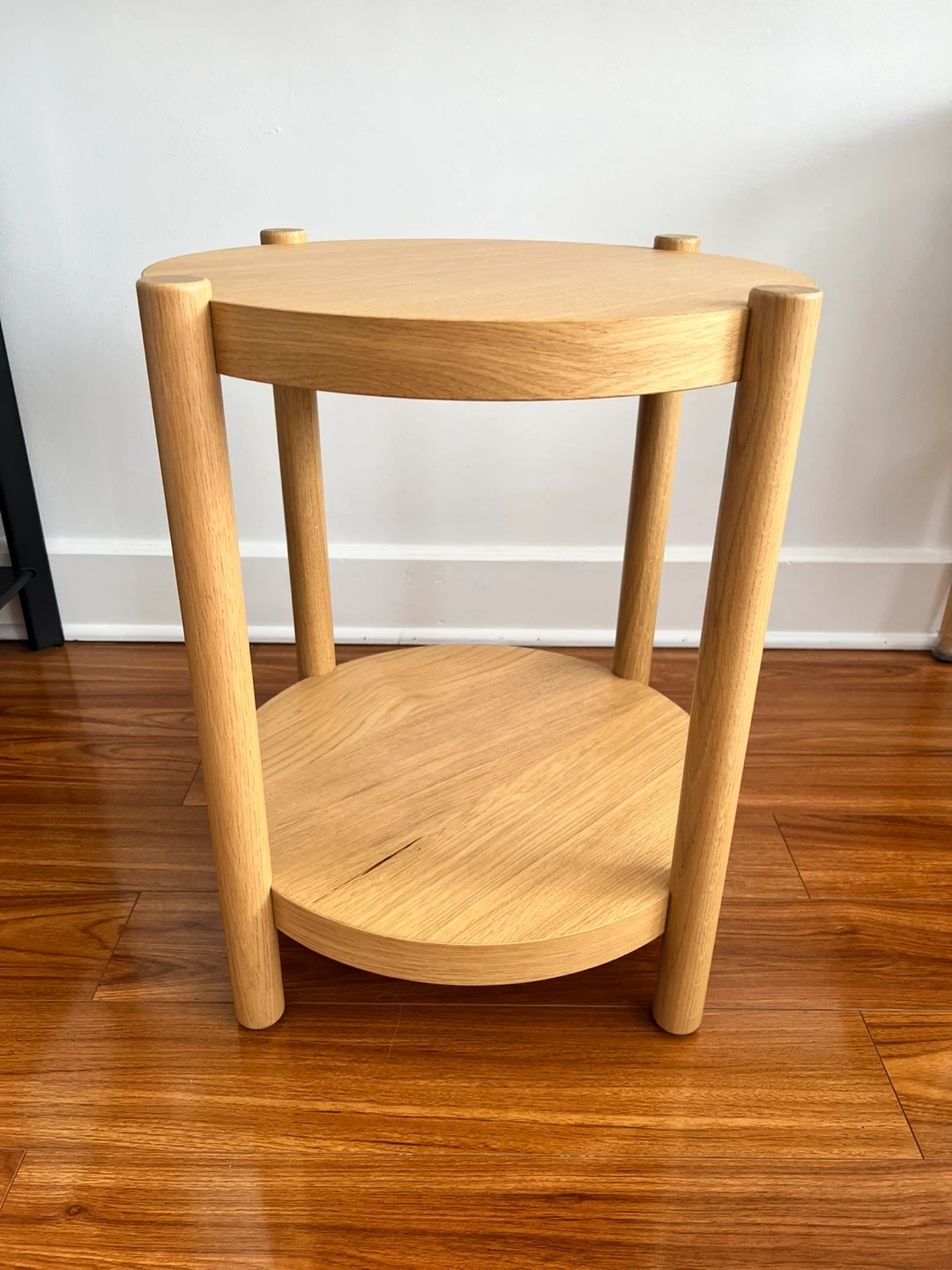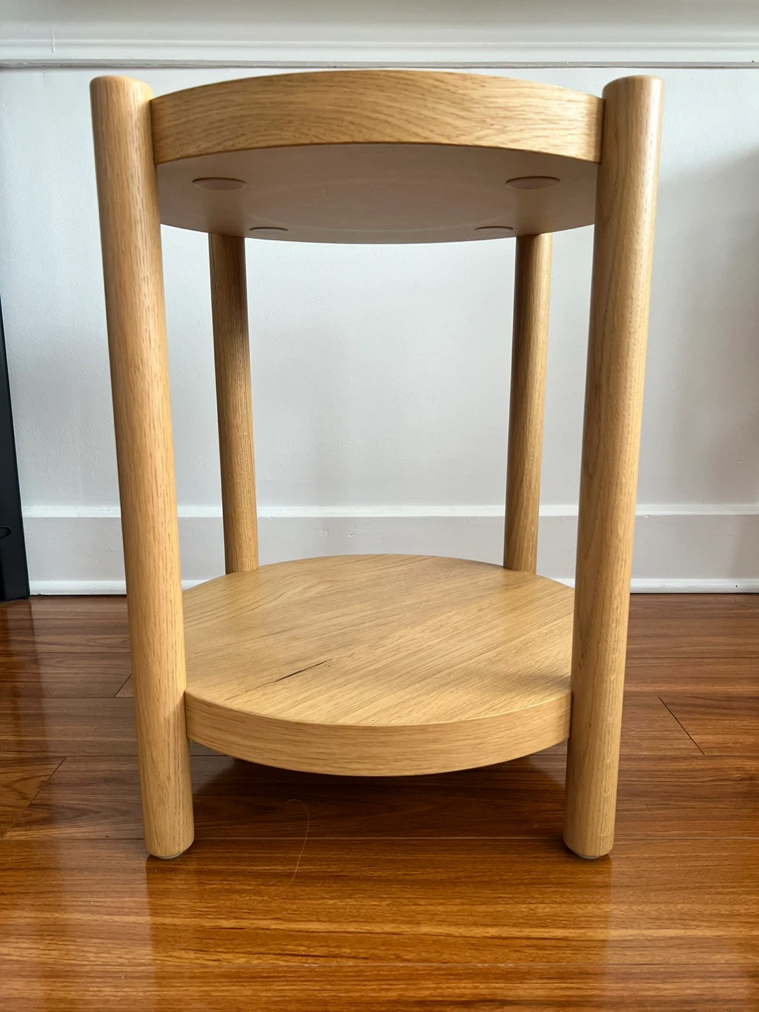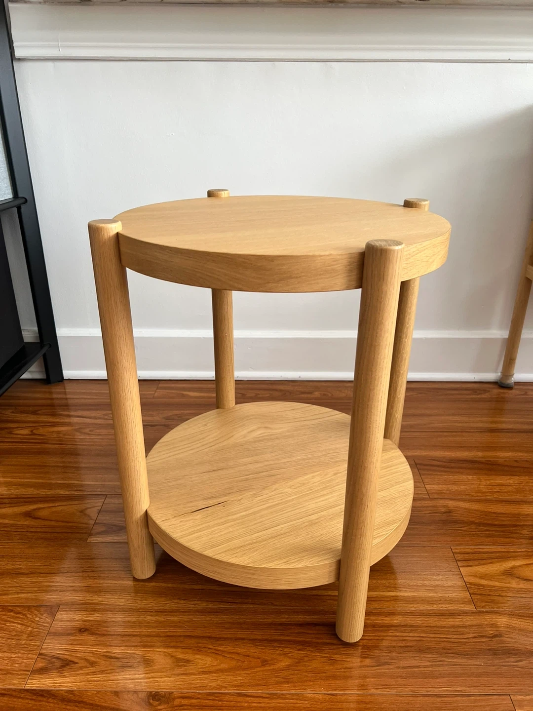 Here's a simple round wooden side table. It features a top and bottom tier for extra storage or display. It would work great as a bedside table or in a living room setting. Originally purchased for $149.99.