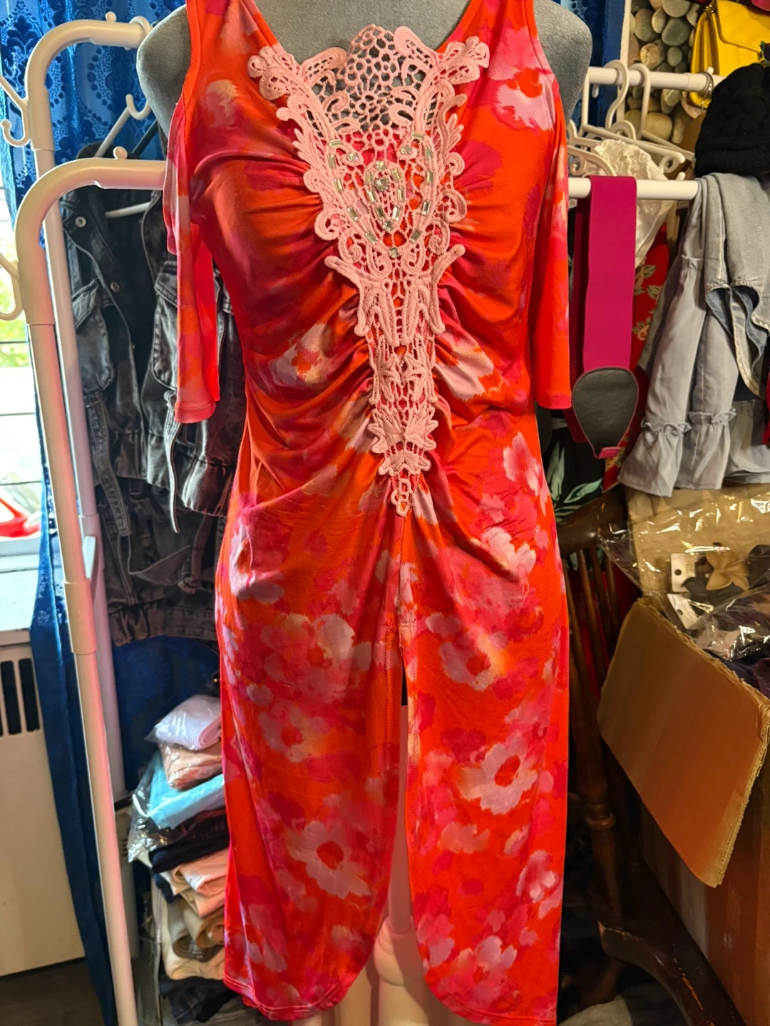 Here's a fun and vibrant floral dress! It features a unique lace detail on the front. The dress is orange with a pink and white floral pattern. It's in great condition and ready for a new home