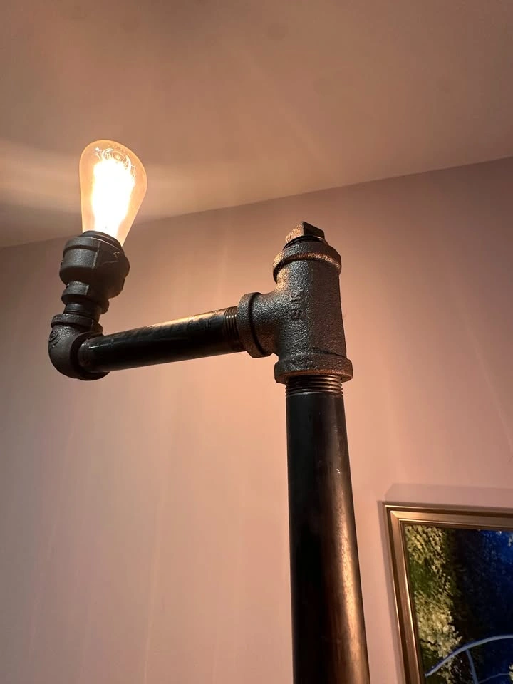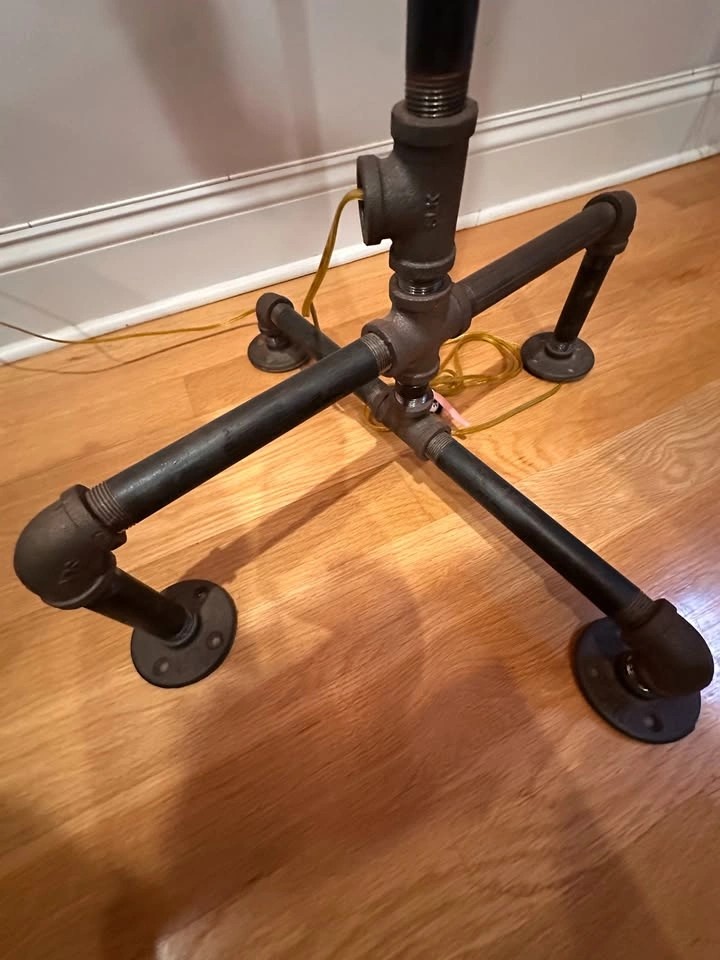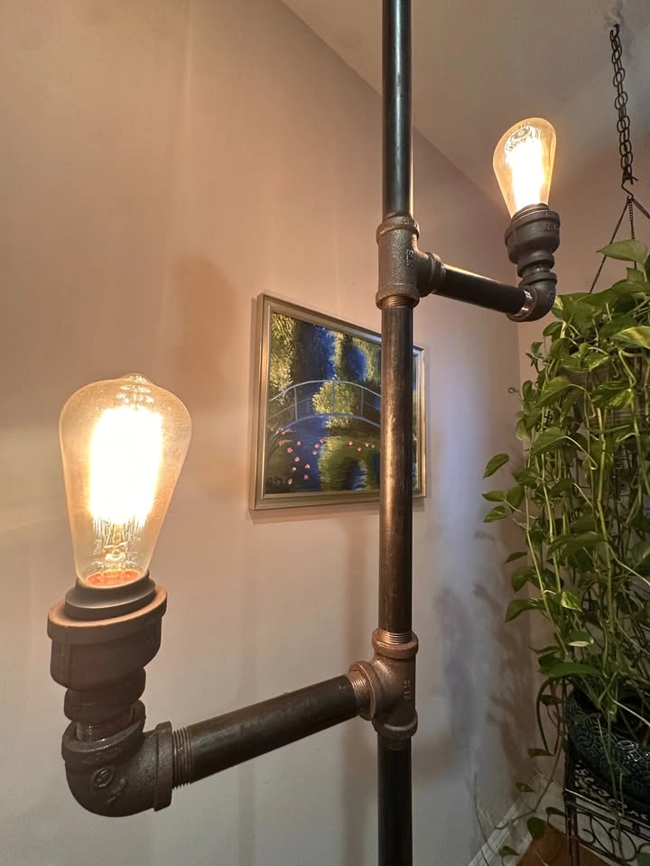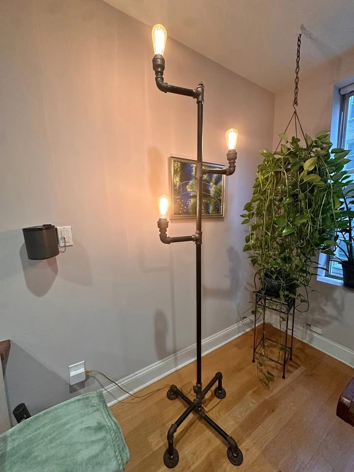 10Floor lamp custom made by me out of plumbing pipes. With feltpads for easy sliding. Bulbs included. Plug in to turn on, can be used with any plug to turn into a dimmable light. 7 feet tall 2 feet wide weights 20 lbs