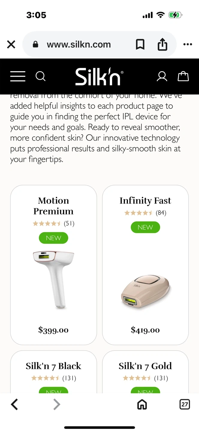 20Hair Removal Devices Discover 4 advanced IPL hair removal devices, designed for safe, effective, and long-lasting hair removal from the comfort of your home. We've added helpful insights to each product page to guide you in finding the perfect IPL device for your needs and goals. Ready to reveal smoother, more confident skin? Our innovative technology puts professional results and silky-smooth skin at your fingertips. Effortless and long lasting hair reduction 4.3 out of 5 stars, average rating value. Achieve ultra-smooth skin effortlessly Powered by innovative HPL™ technology: IPL made safe for home use Safe, painless, and customizable for your skin and hair type Enjoy long-lasting results with regular use Brand new sells for $399.00 Silkn.com